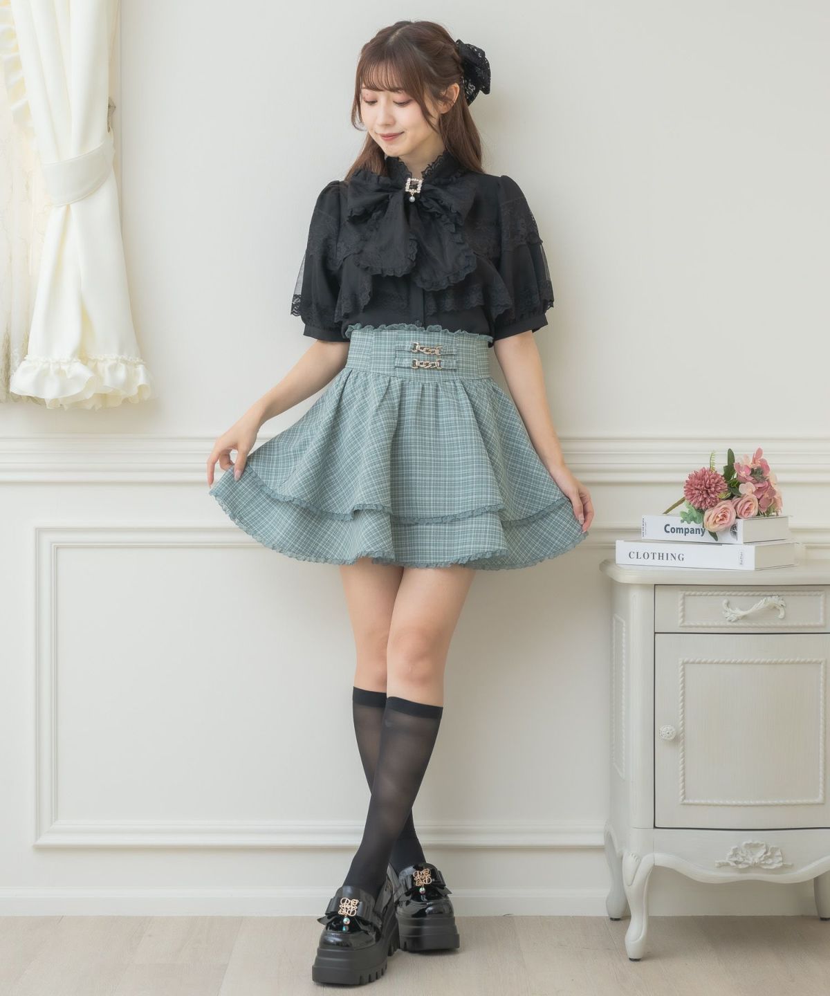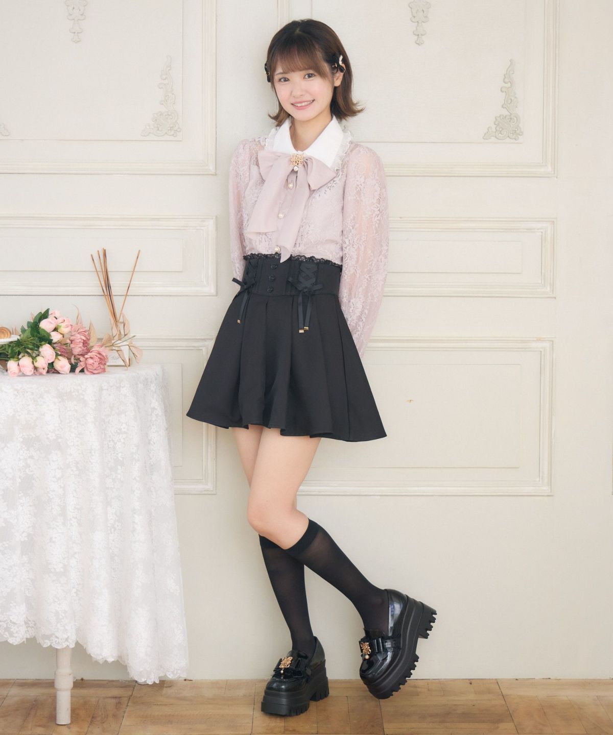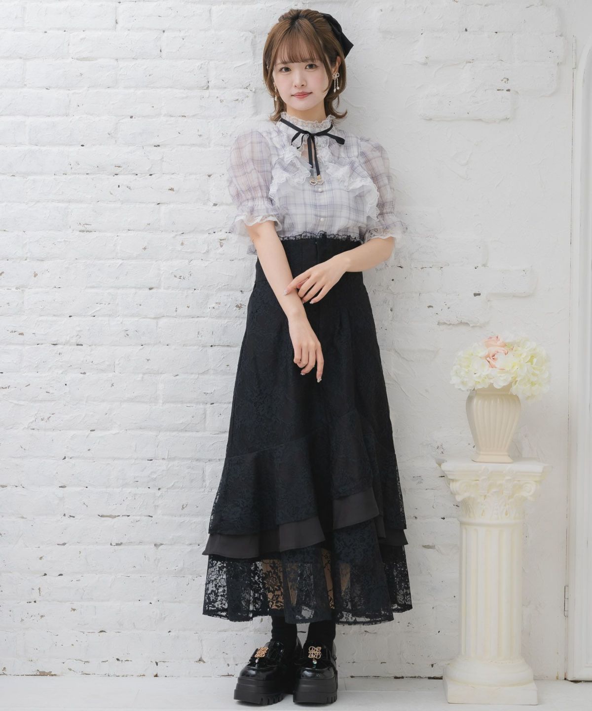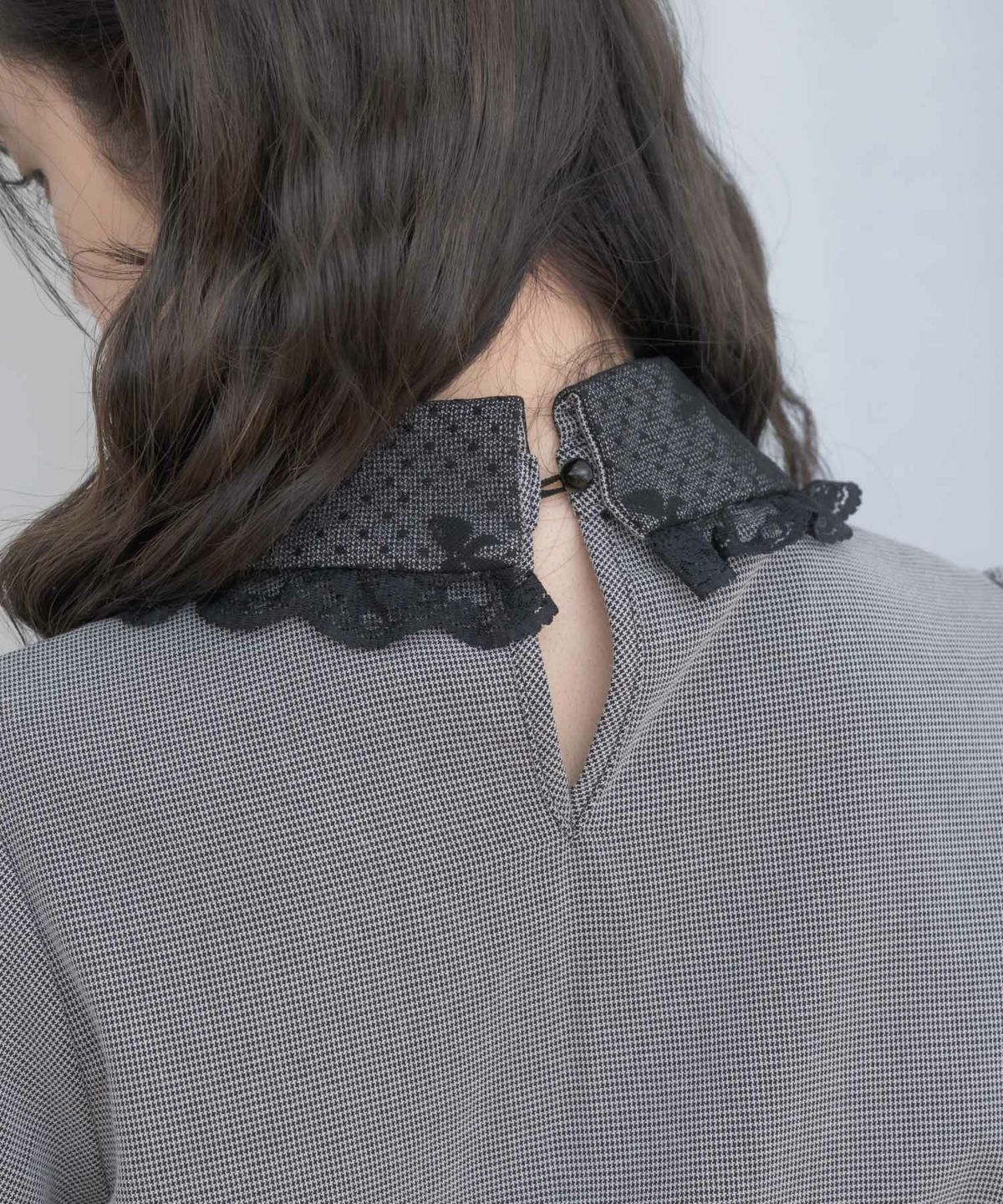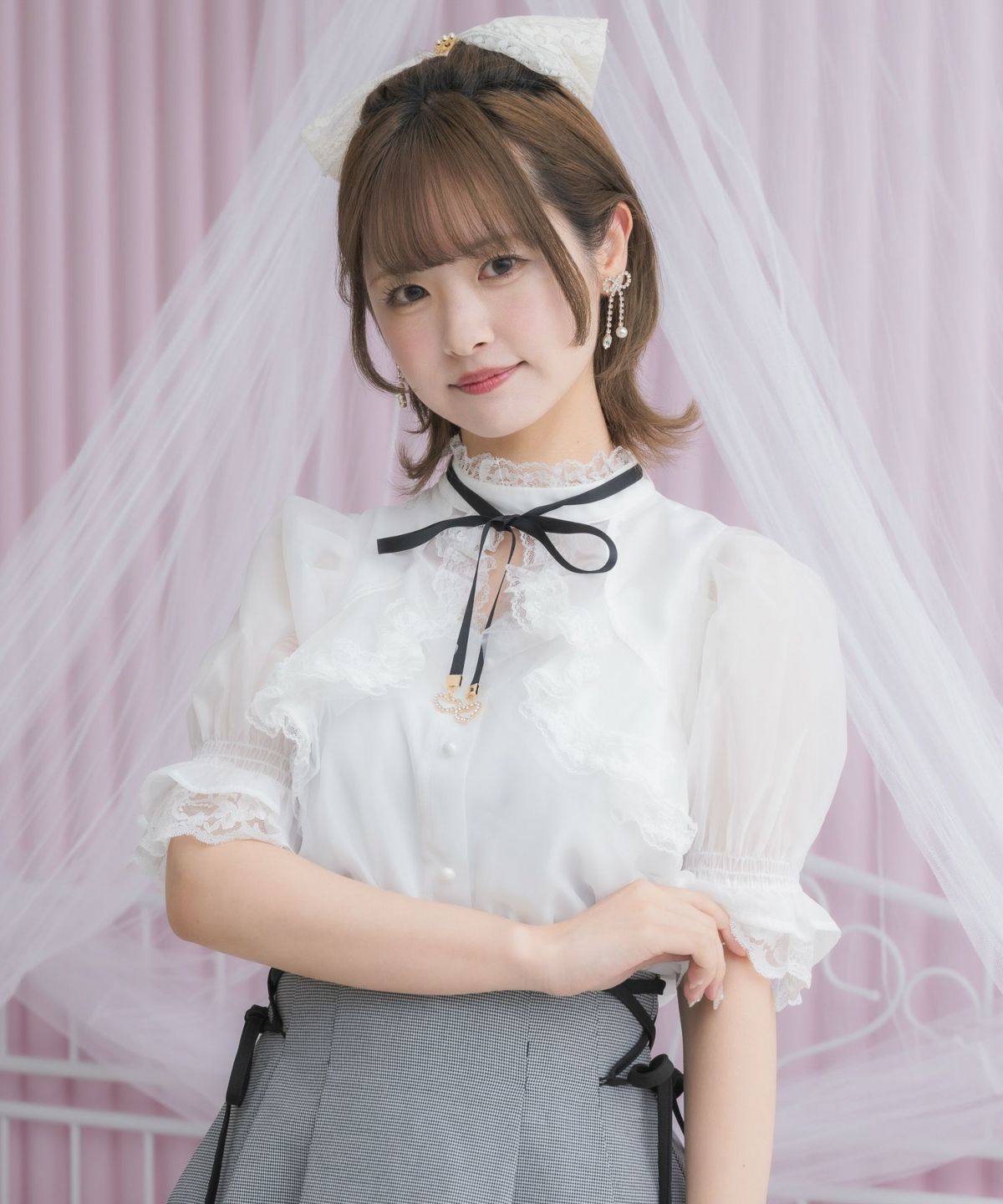 レース切替ボウタイラッフルブラウス