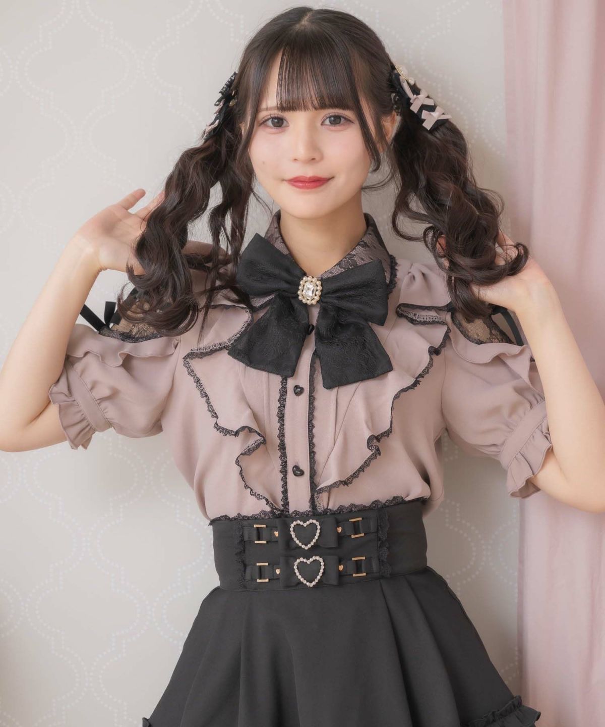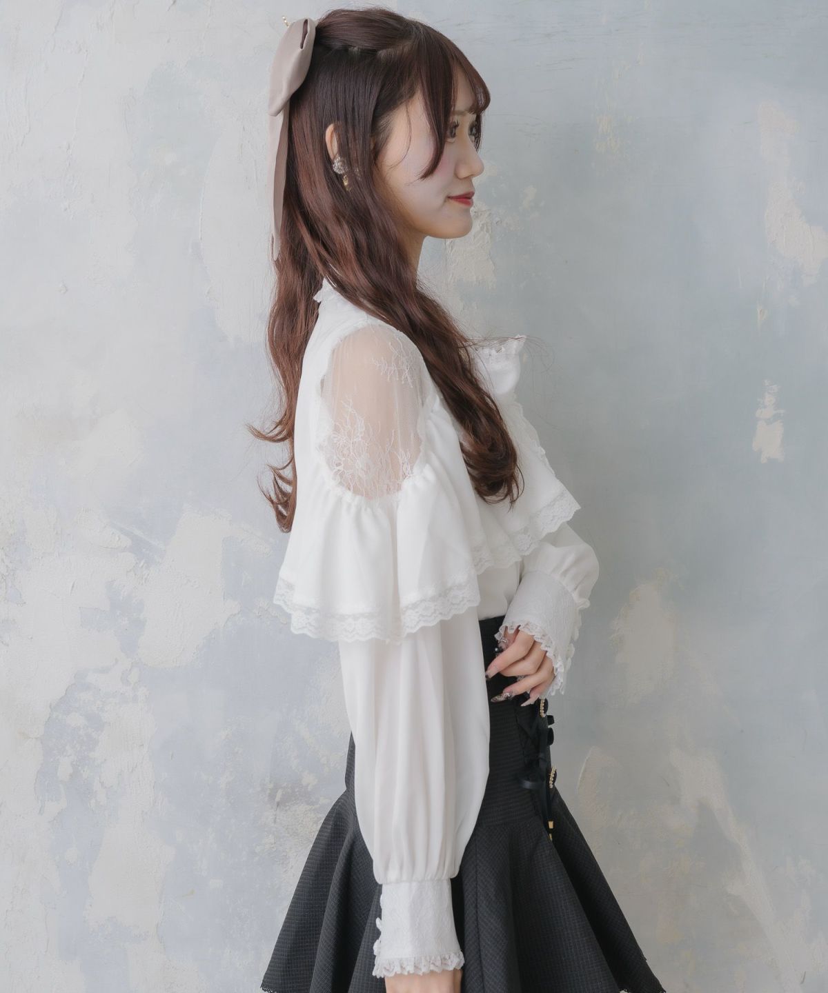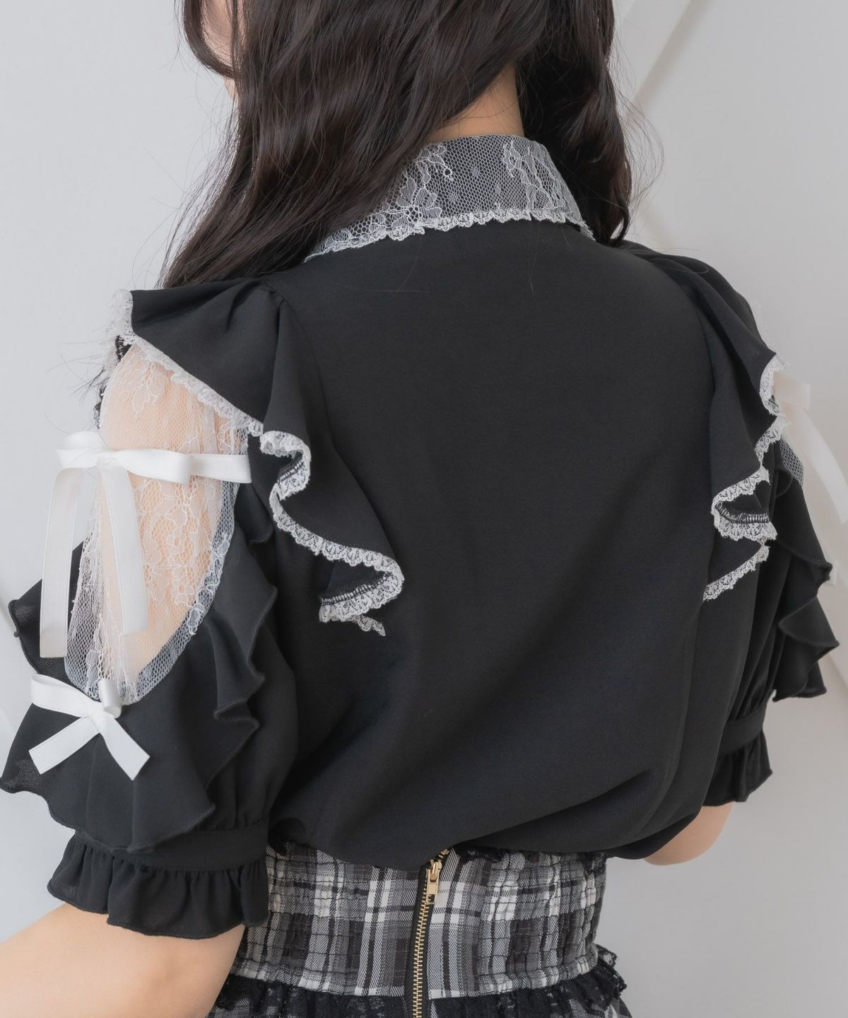肩レースダブルリボンフリルデザインブラウス
