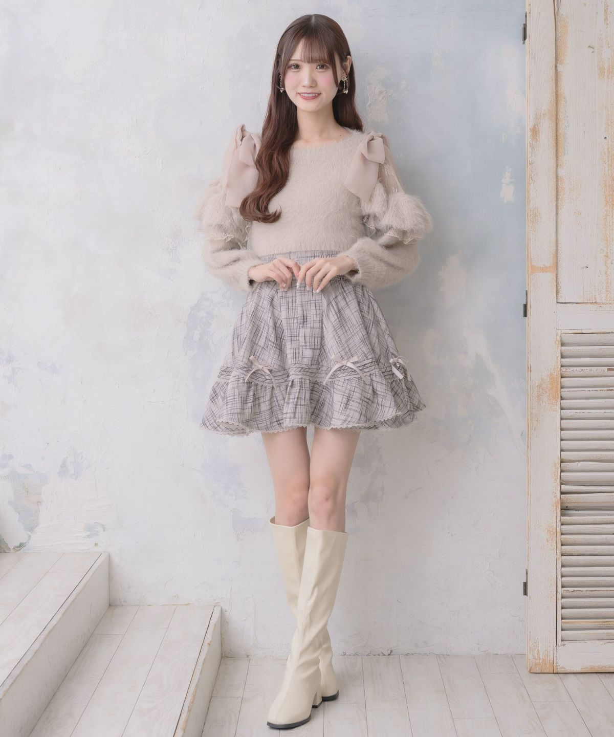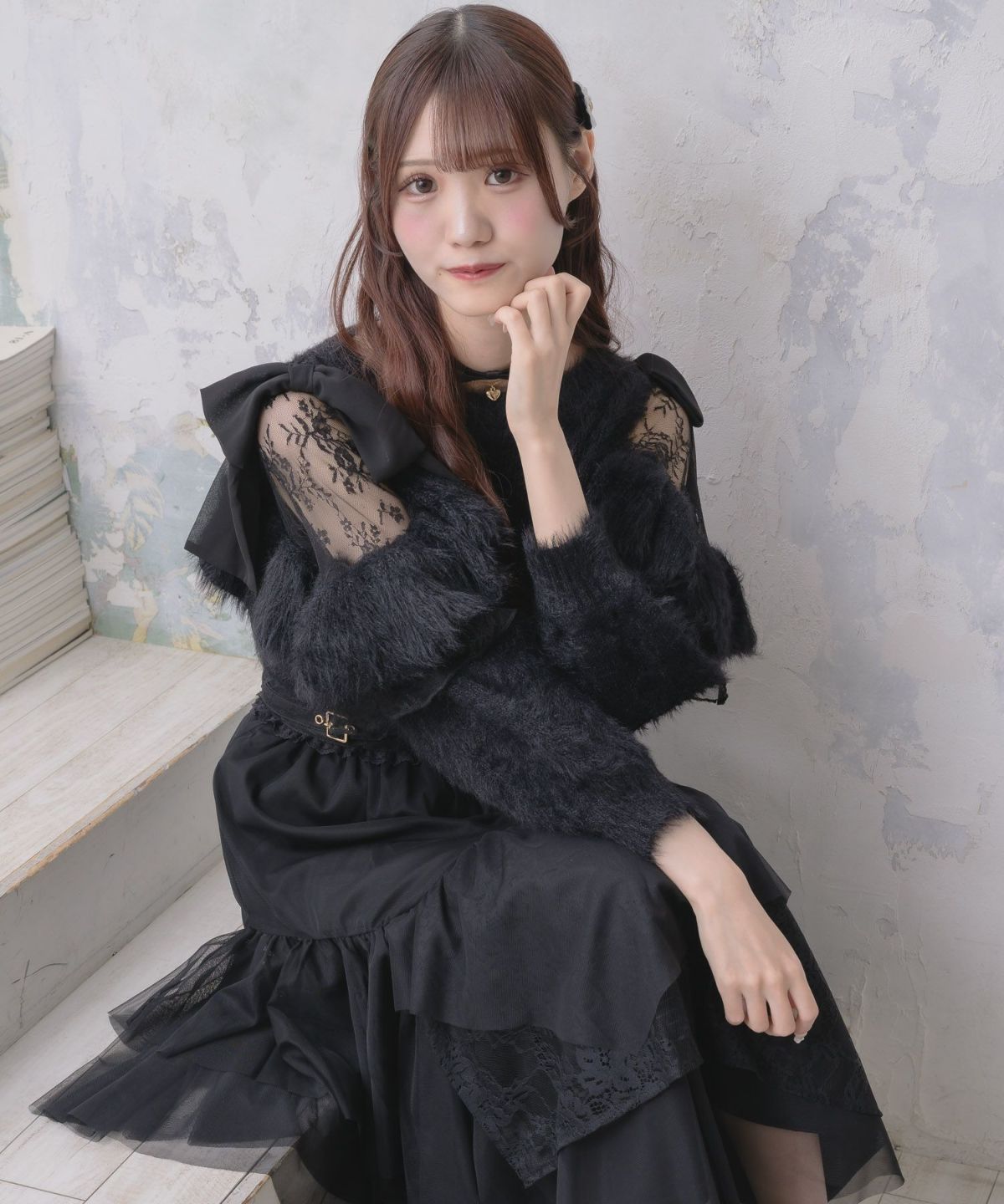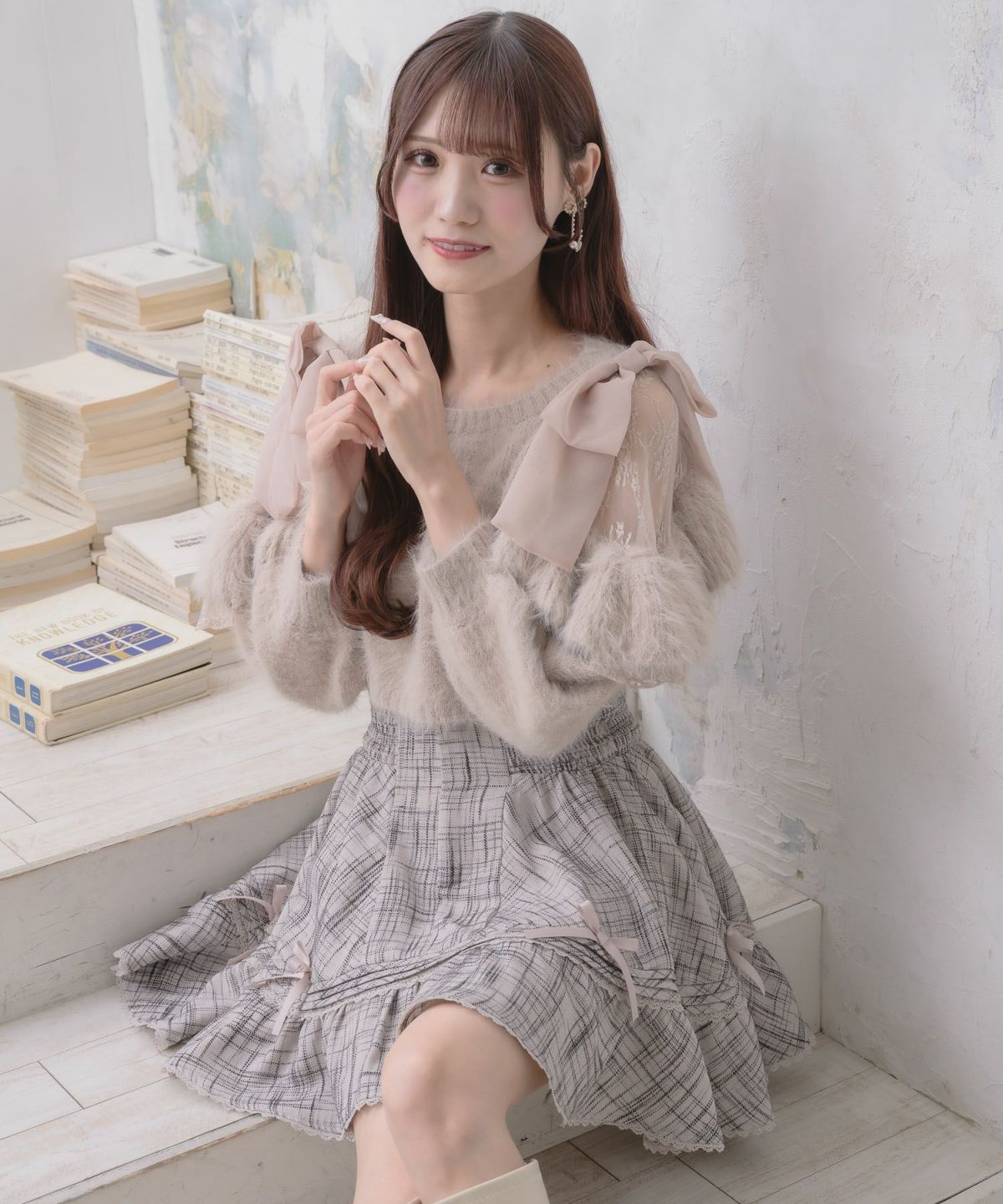 肩開リボンシャギーニット
