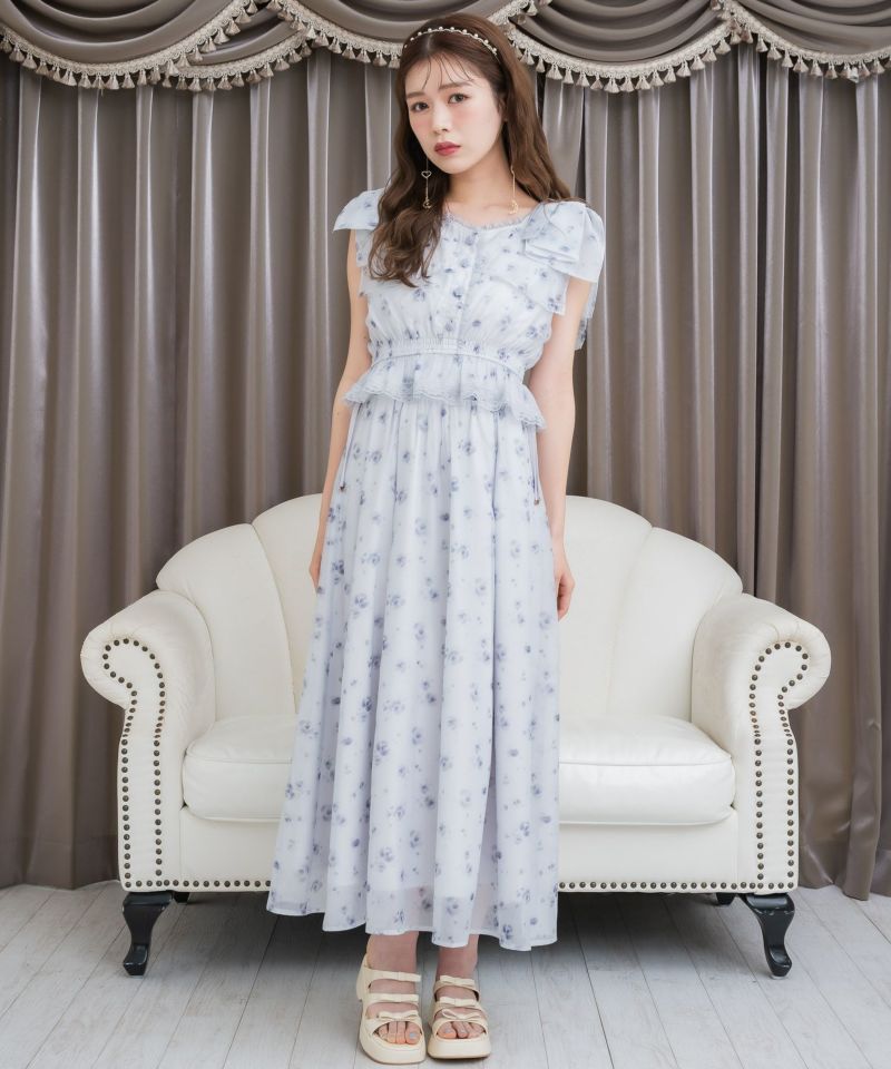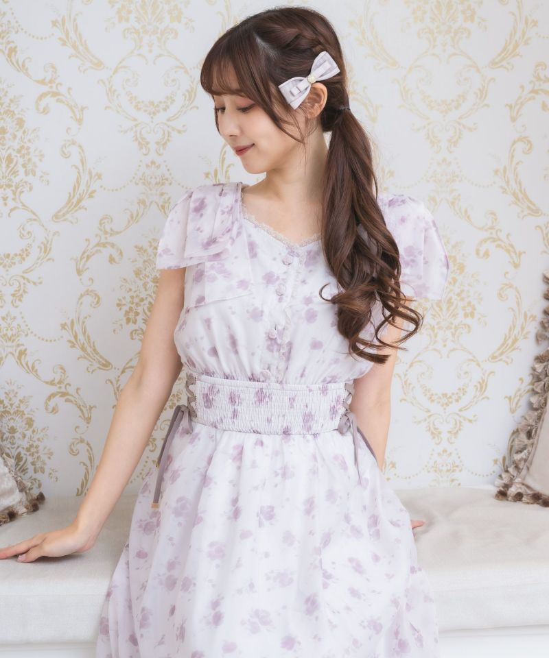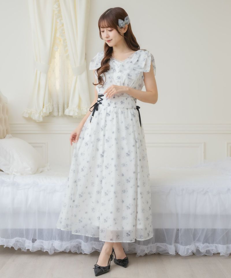 トップスIN/OUTどちらもOK♡ノースリーブブラウス×フレアスカートのセットアイテム。小ぶりで可愛い花柄と、肩に施したリボンが乙女心をくすぐります。スカートはしっかりウエストマークがされていてバランスの良いアイテム◎