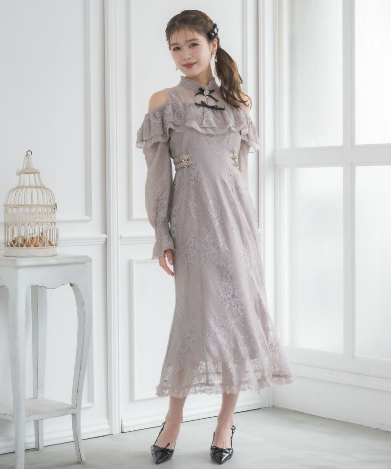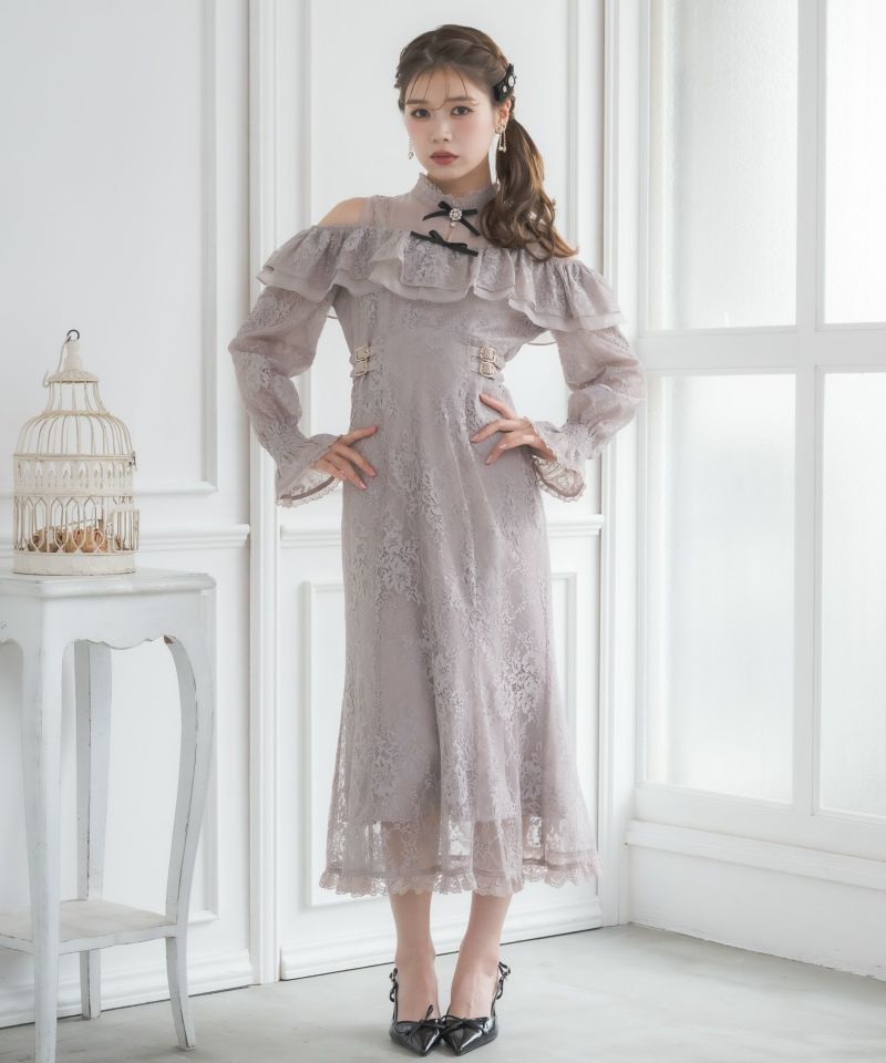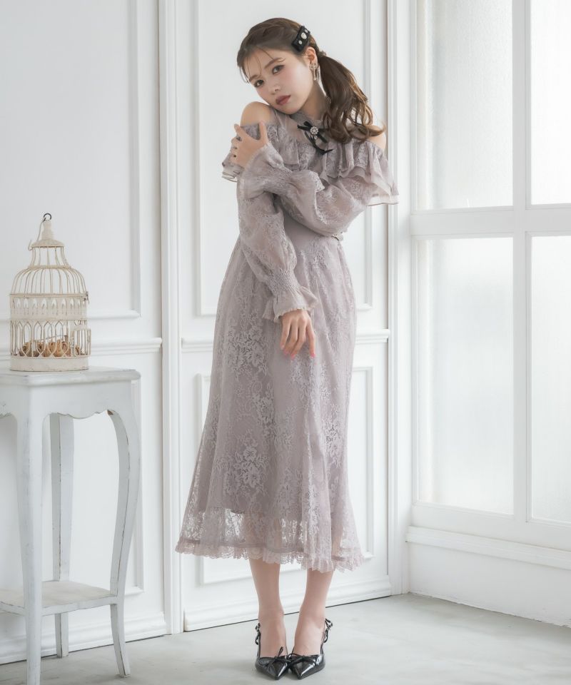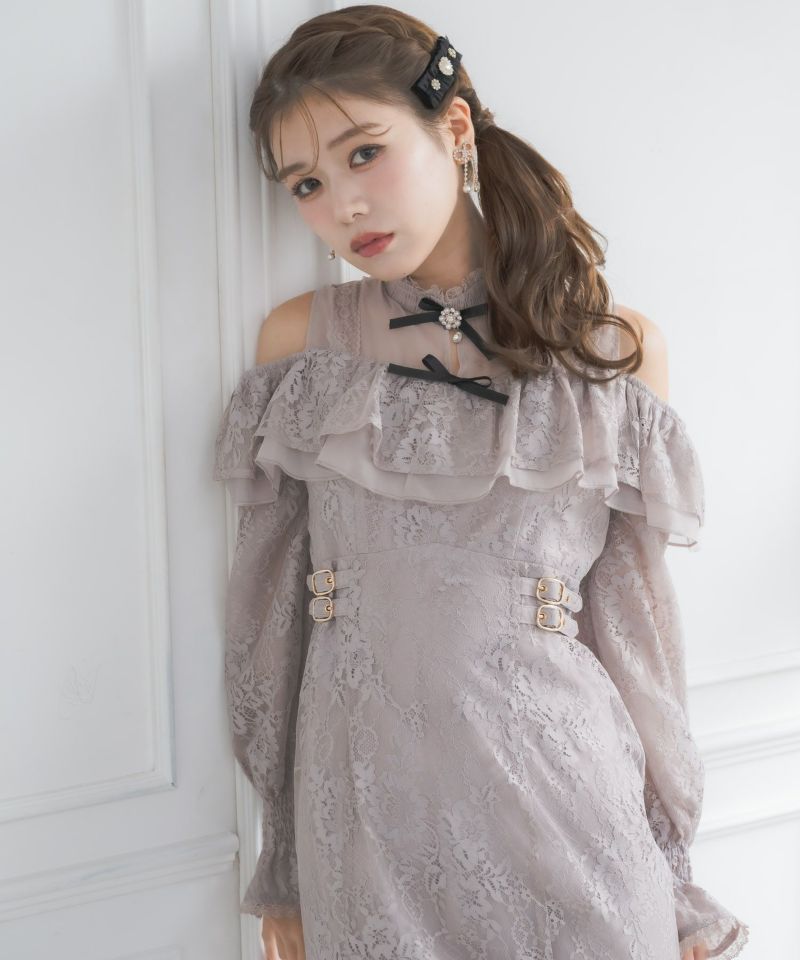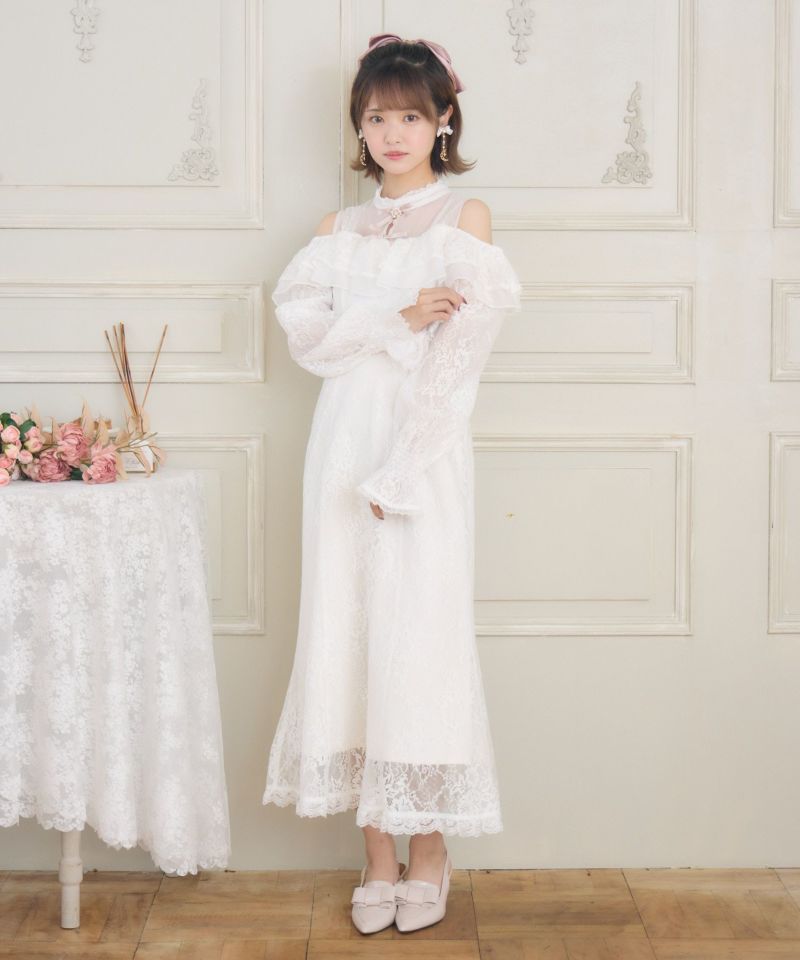 肩開きがヘルシーな大人っぽさを演出♪オフショルに施したフリルが肩周りを華奢に見せてくれ、女性らしさUPすること間違いなし◎繊細なレース使いで上品可愛く、歩くたびに揺れるエアリーな素材も裏地付きで安心です。