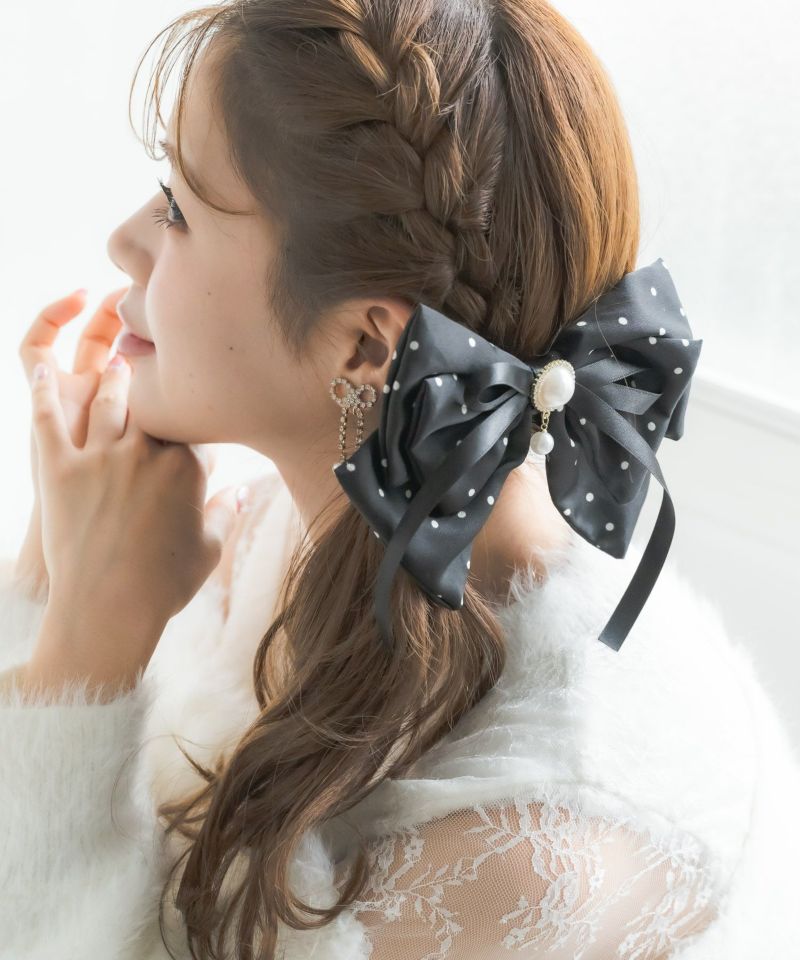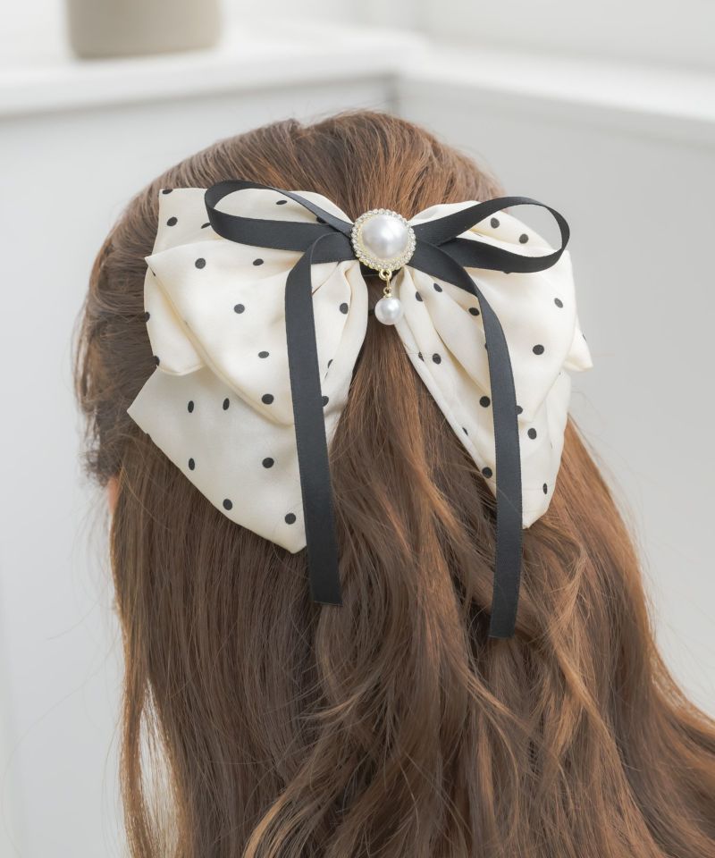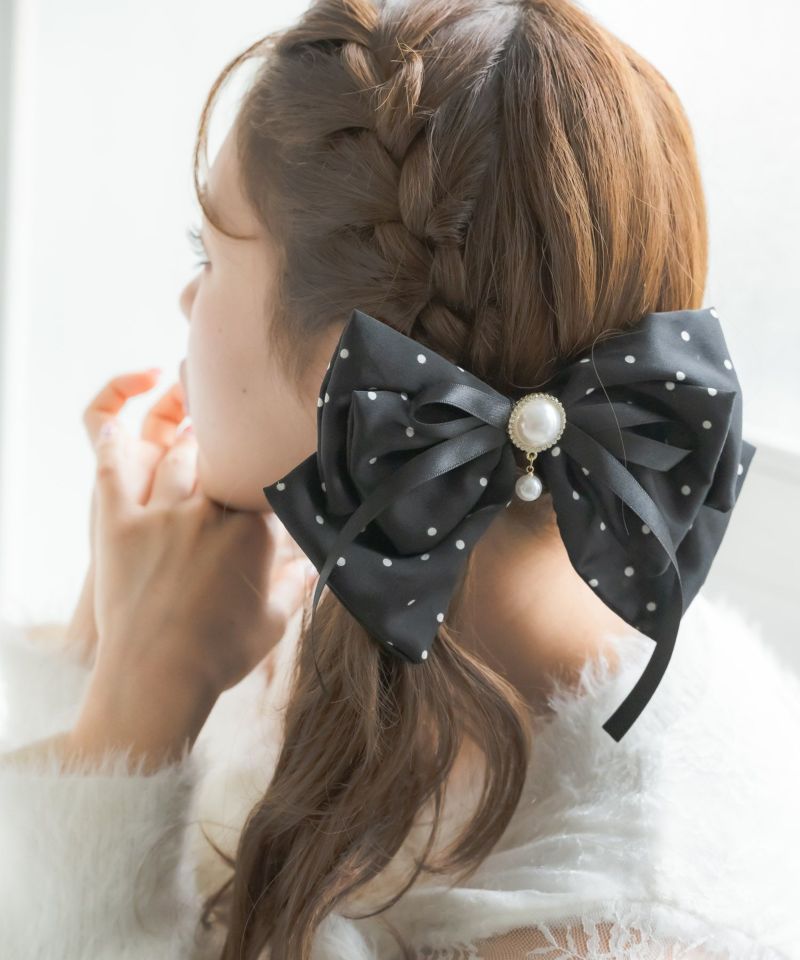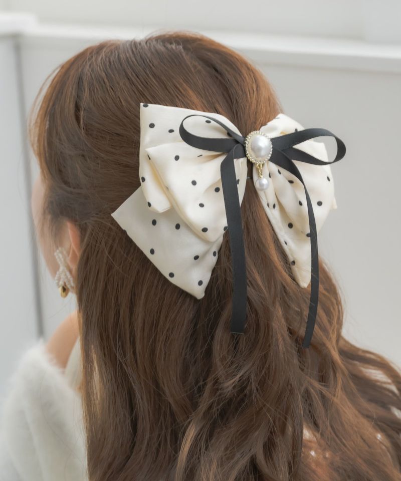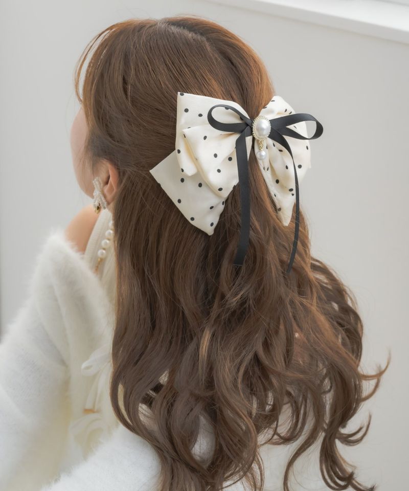 ドットがスタイリングのアクセントに♪フレンチガーリーなリボンをメインに、華奢なリボン重ねが周りとの差をつけてくれます。リボンの形態を対照的にしたことで洒落感をブラッシュアップ◎ ※照明の関係で実際のお色味と若干異なる場合がございます。 ※表示のサイズ感と実物は若干異なる場合がございますので、予めご了承ください。