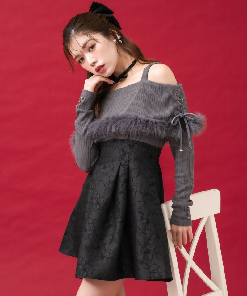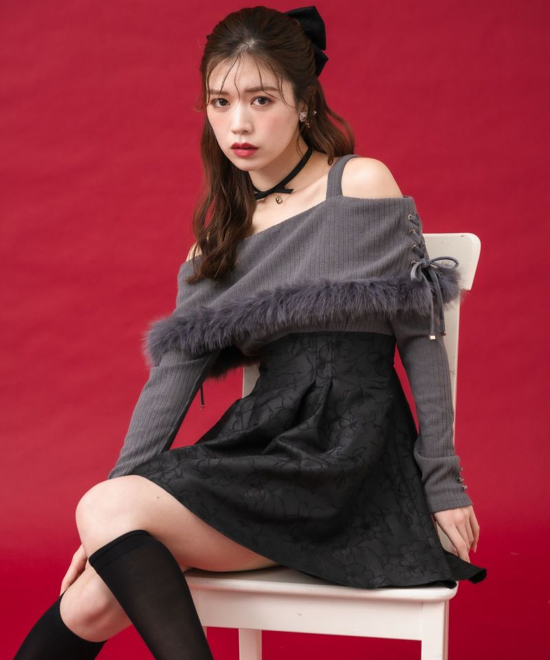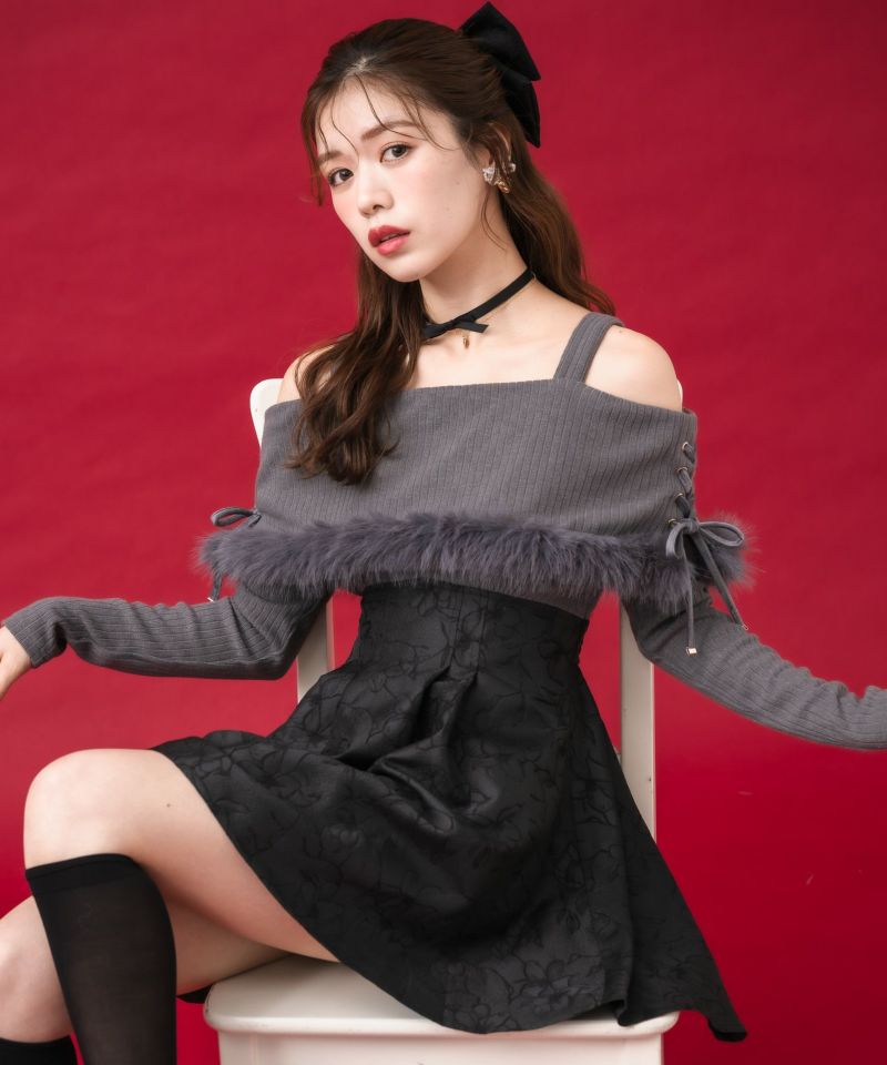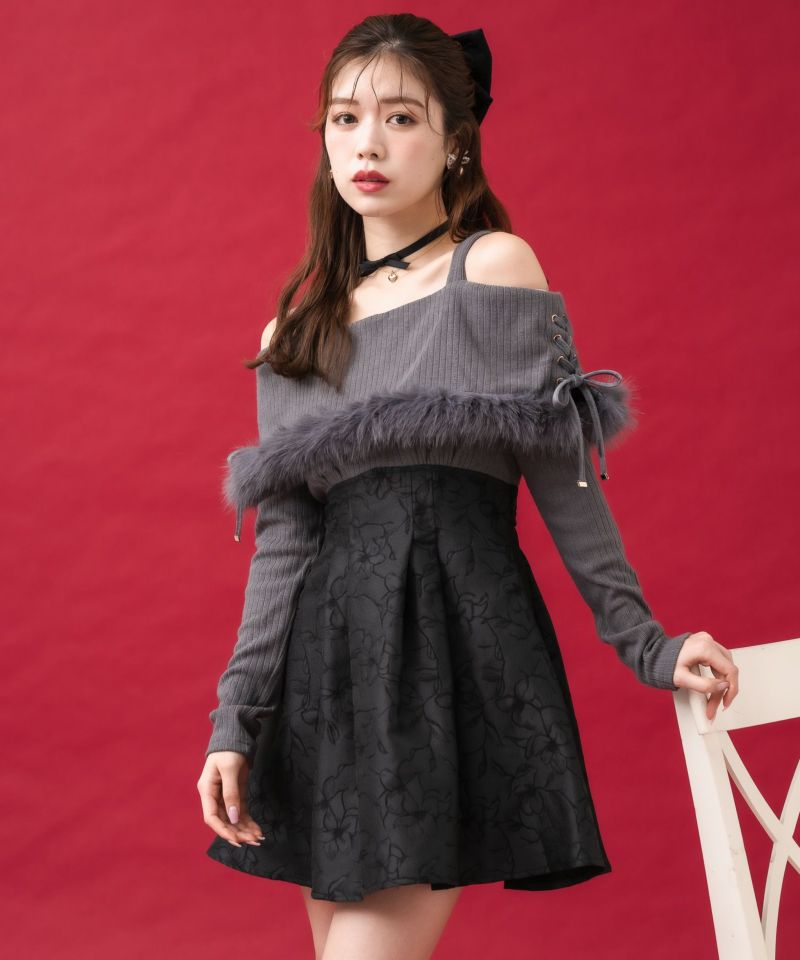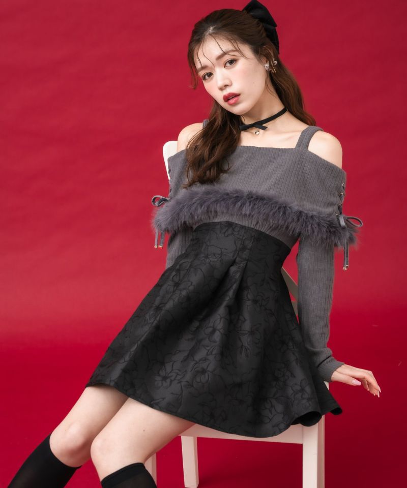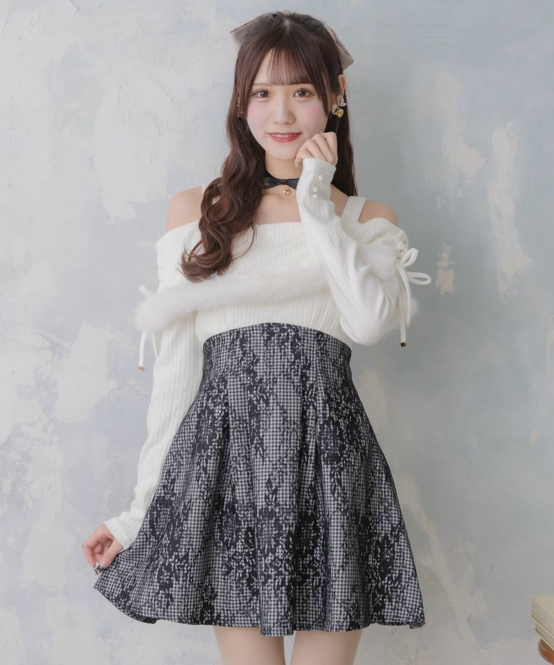 パターン柄スカートとのドッキングで、着るだけでドラマティックな印象に♡テレコ素材のトップスにはふわふわのファーをあしらい、冬らしいあざと可愛いムードをON♪ウエスト周りをすっきり見せるシルエットで、美しいスタイルアップも叶います。ロングブーツやハイソックスと合わせれば、冬のコーディネートもバランスよくキマる一枚です。