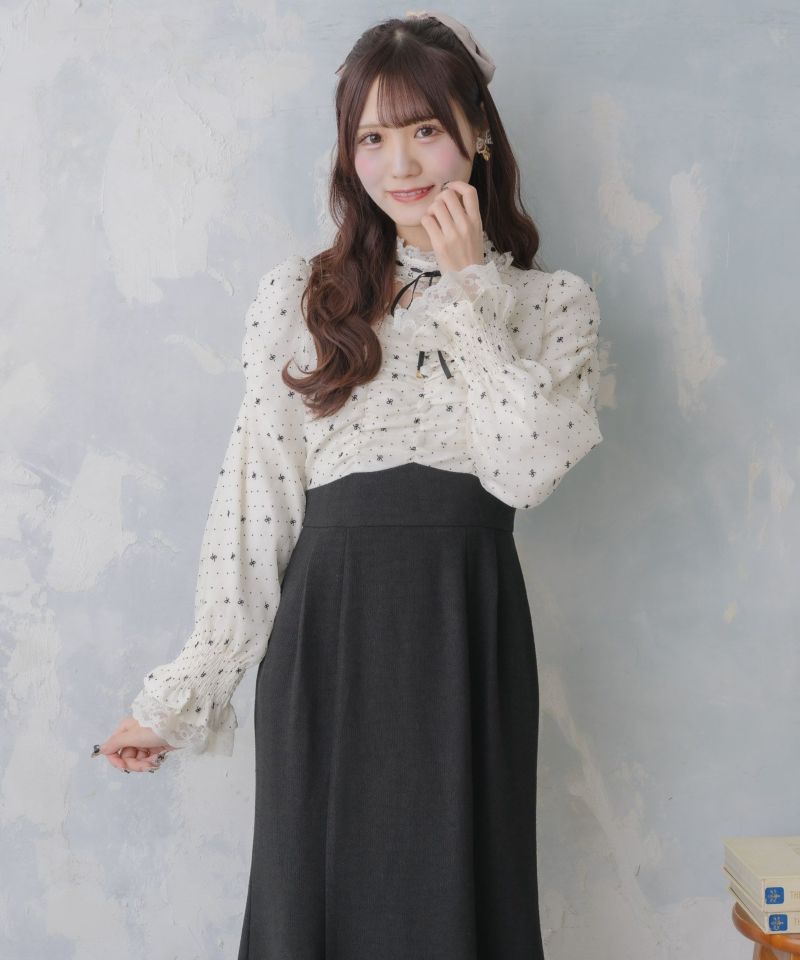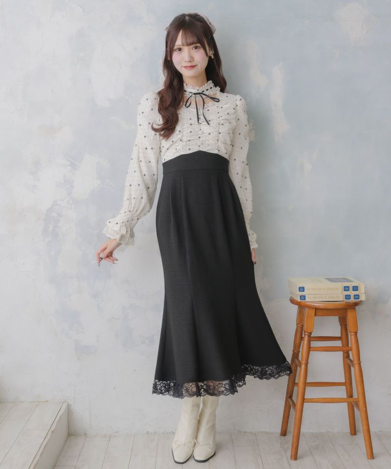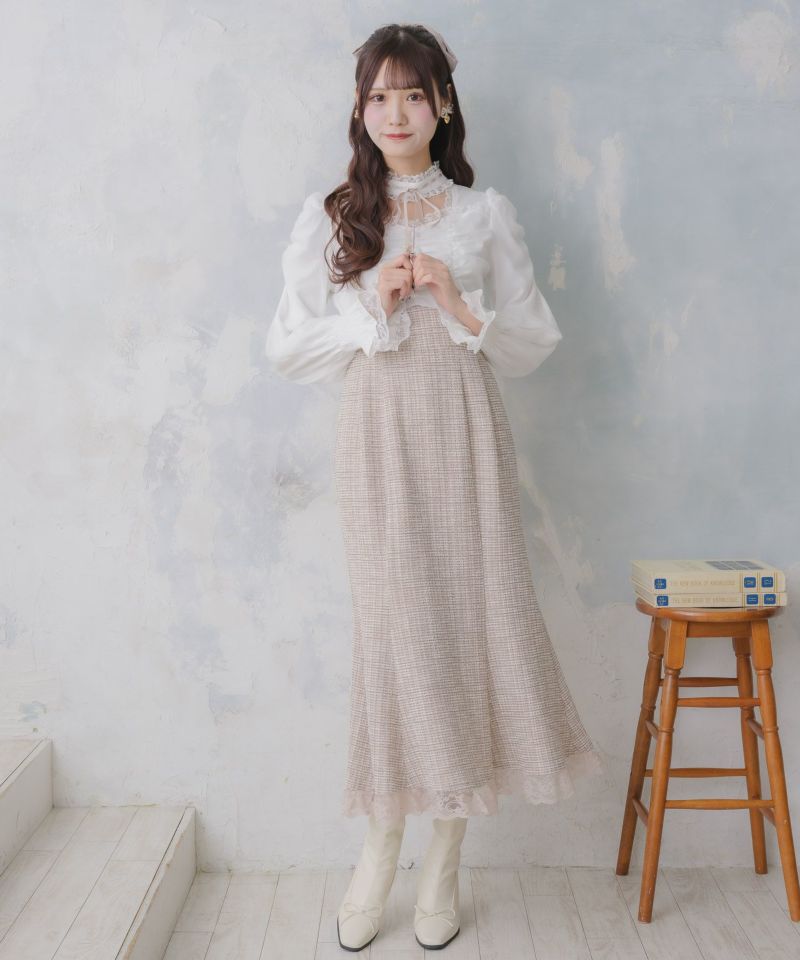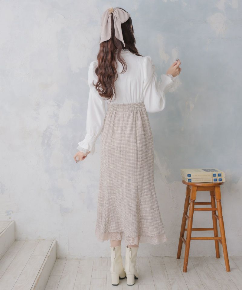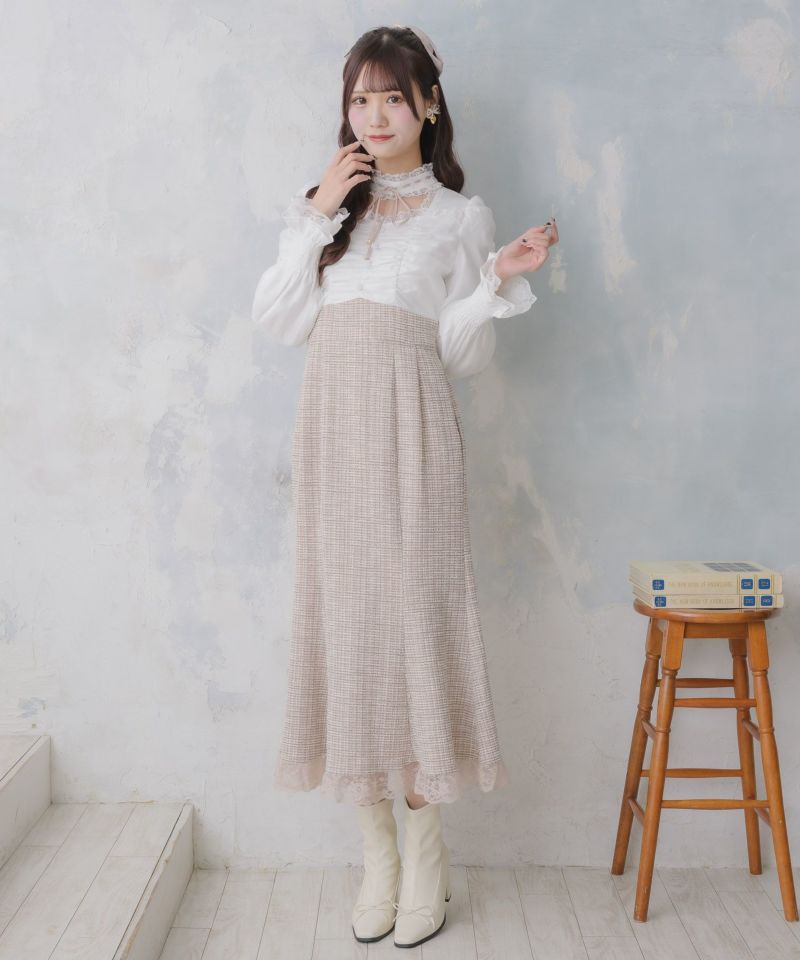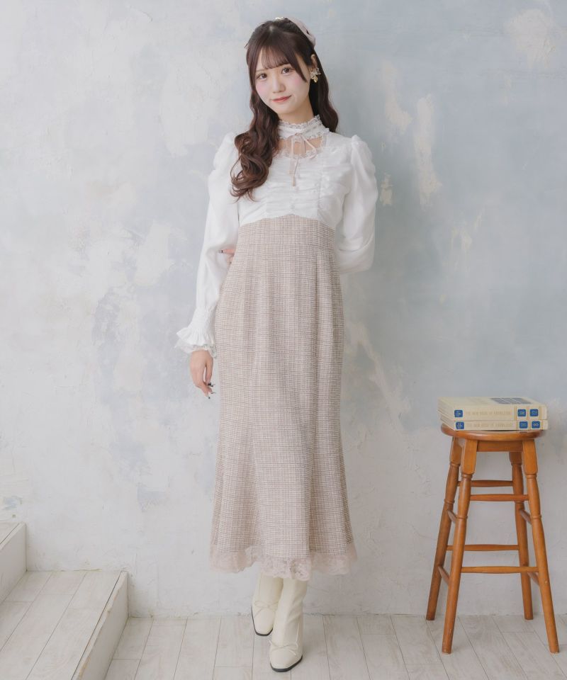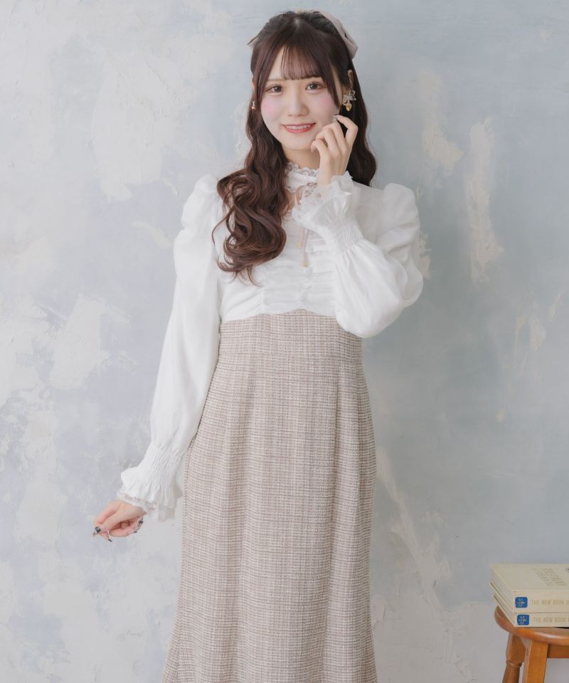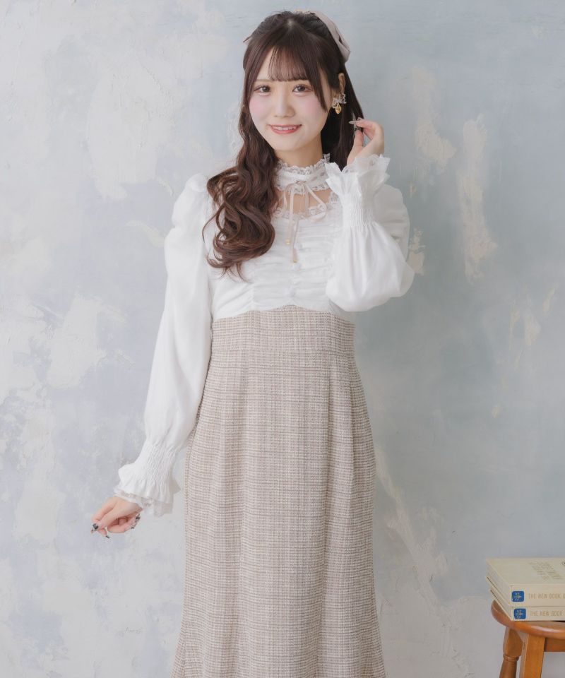首元のフリルチョーカーには、はしごレーステープをあしらい、繊細で上品なアクセントをプラス♡前身頃にはたっぷりとギャザーを寄せ、柔らかな表情と立体感を演出します。ハイウエストで切り替えたマーメイドシルエットが、女性らしいラインを美しく際立たせるデザイン。スカート部分はツイード調素材を使用し、上品で季節感のある仕上がりに◎ ※照明の関係で実際のお色味と若干異なる場合がございます。 ※表示のサイズ感と実物は若干異なる場合がございますので、予めご了承ください。 モデル身長:165cm