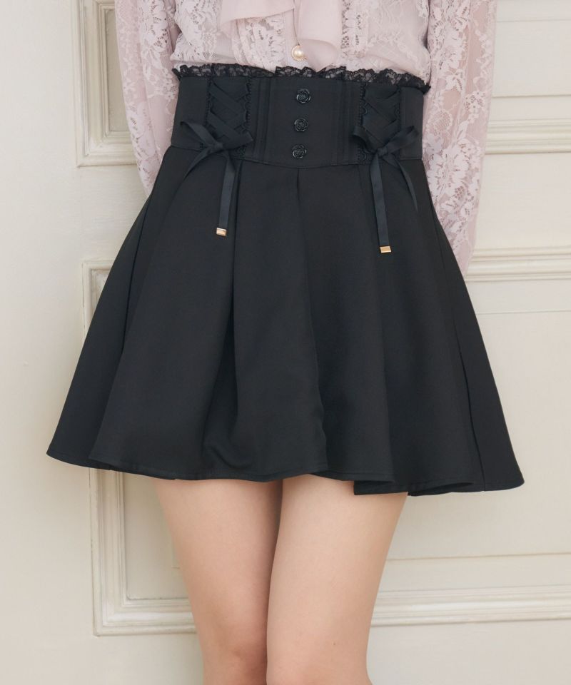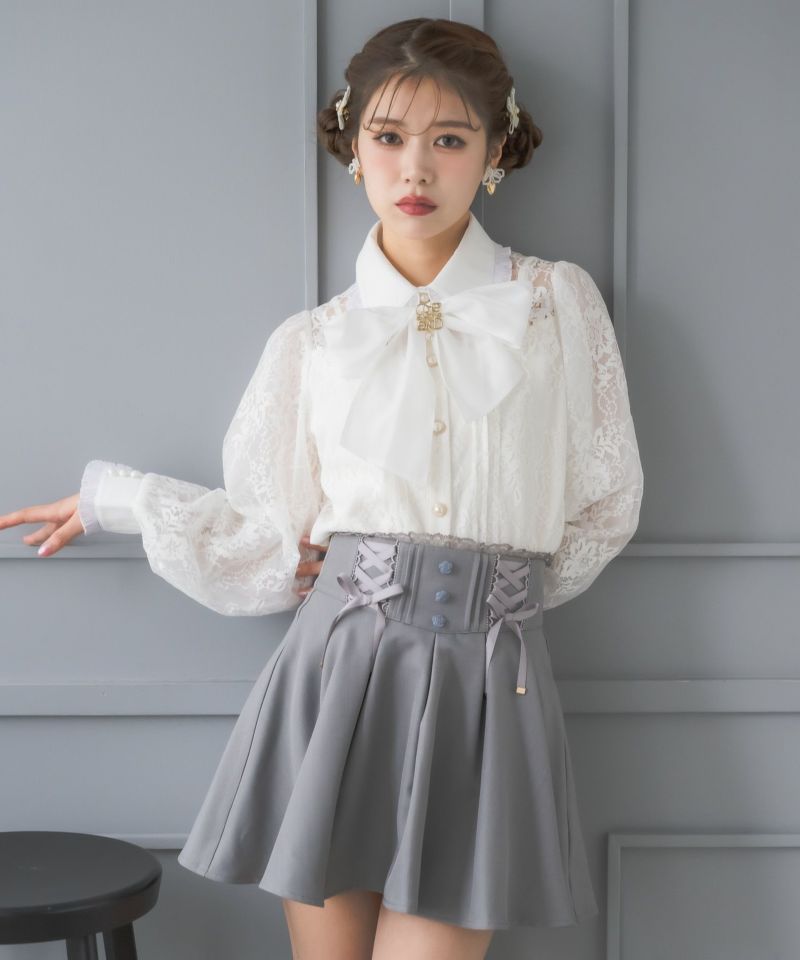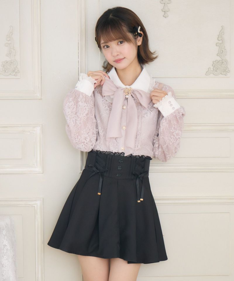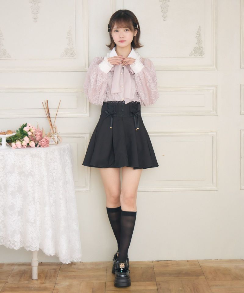 薔薇釦とレースアップの組み合わせが好印象♡ディテールも同系色でまとめているのでコーデのバランスもとりやすく、シーズンライクなカラバリで旬顔をメイクしてくれます。ウエストのフリルはシアーで抜け感をプラス♪