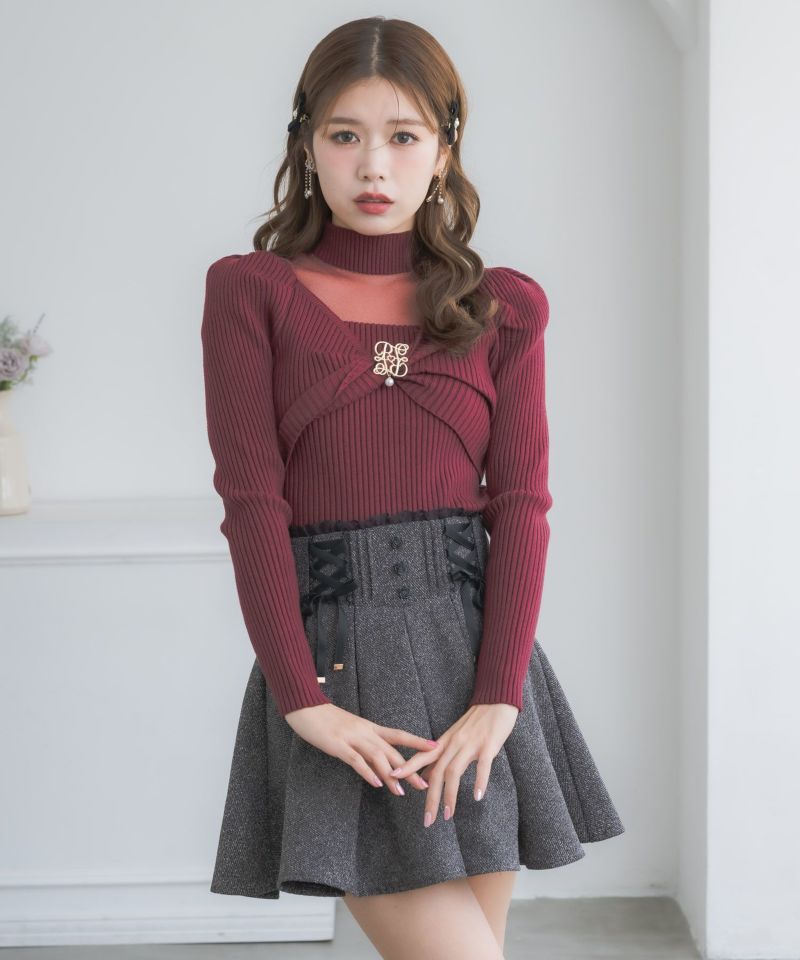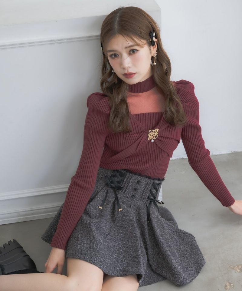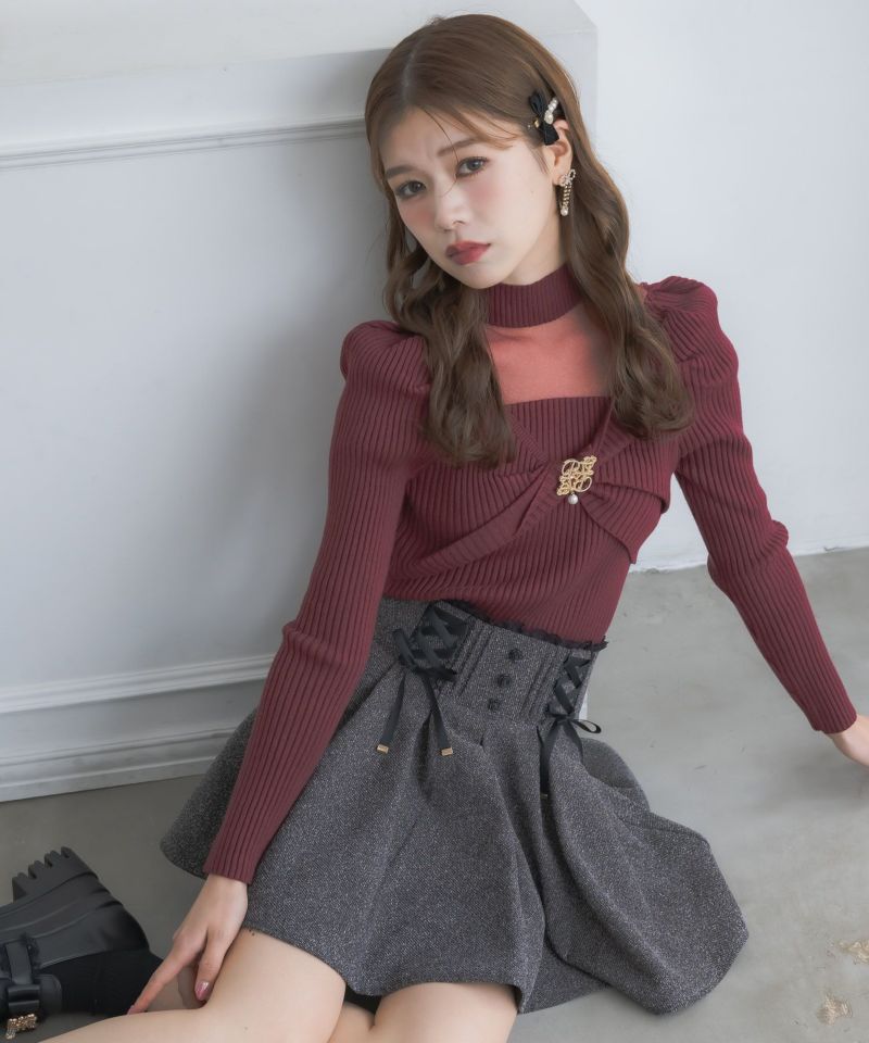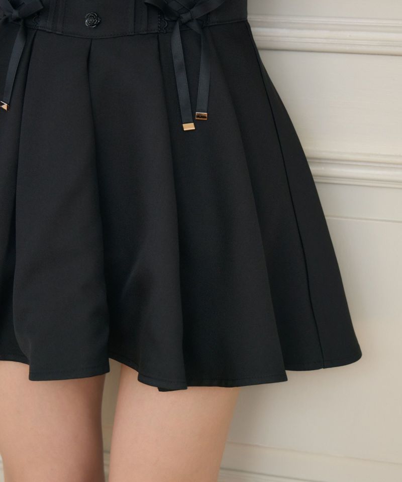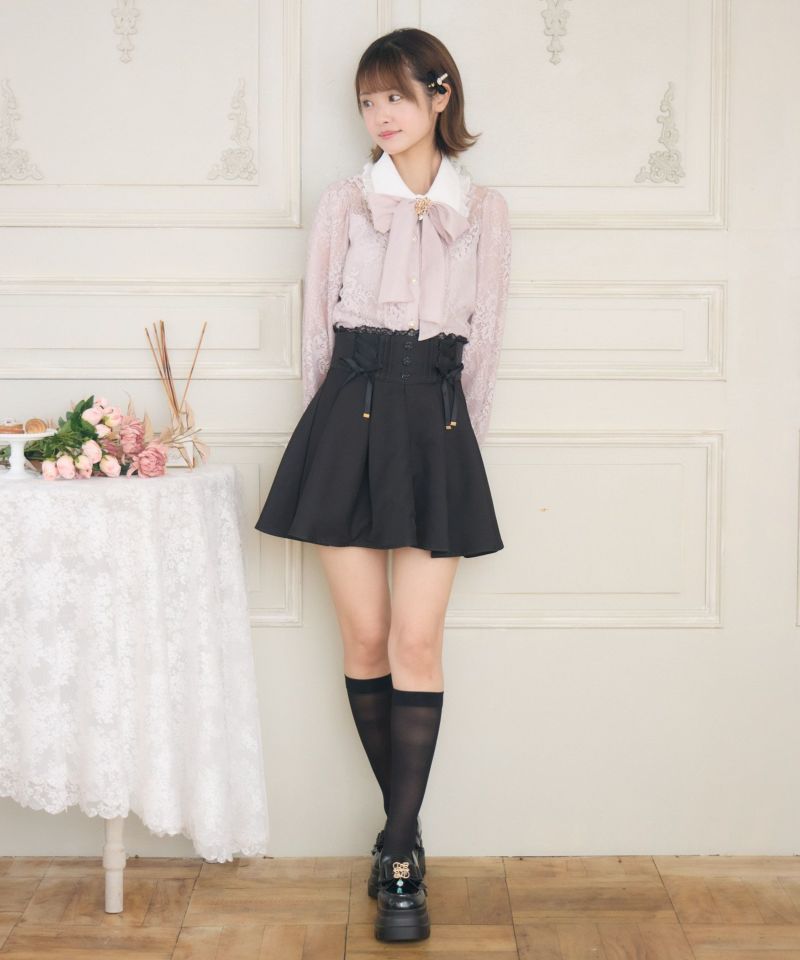 薔薇釦とレースアップの組み合わせが好印象♡ディテールも同系色でまとめているのでコーデのバランスもとりやすく、シーズンライクなカラバリで旬顔をメイクしてくれます。ウエストのフリルはシアーで抜け感をプラス♪