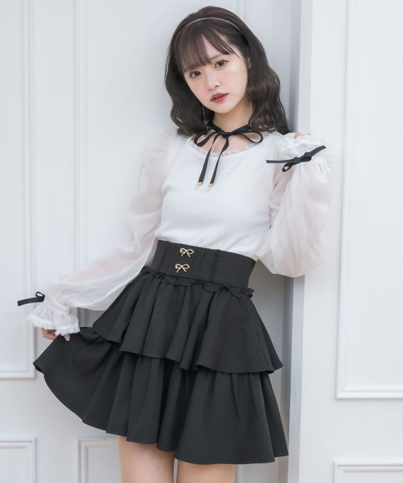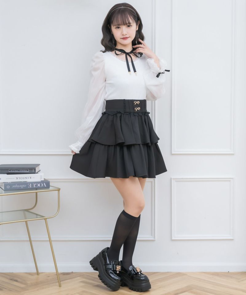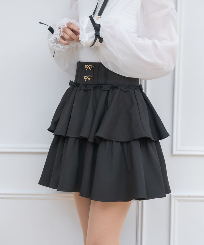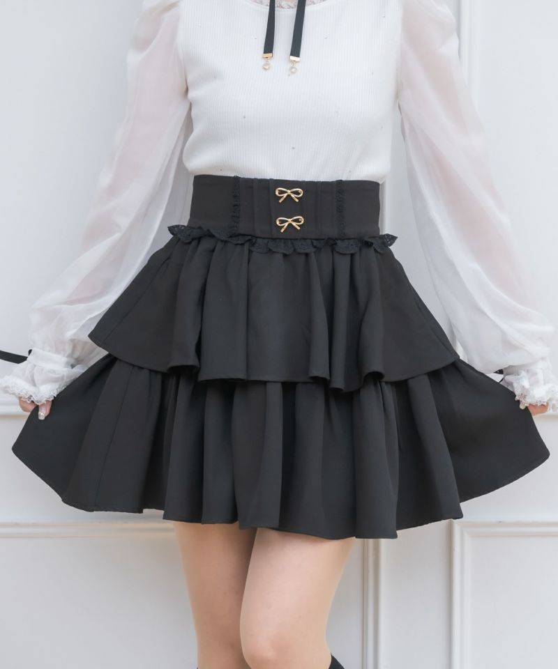 チャームポイントのメタルミニリボンがコーデのアクセントに♪ウエストはすっきりと仕立てられ、ボリューム感のある2段フリルが華やかさをプラスします。コーデの主役になるチェックと、マルチに活躍期待のブラックの2色展開です。 ※照明の関係で実際のお色味と若干異なる場合がございます。 ※表示のサイズ感と実物は若干異なる場合がございますので、予めご了承ください。 モデル身長ブラック160cm/チェック161cm