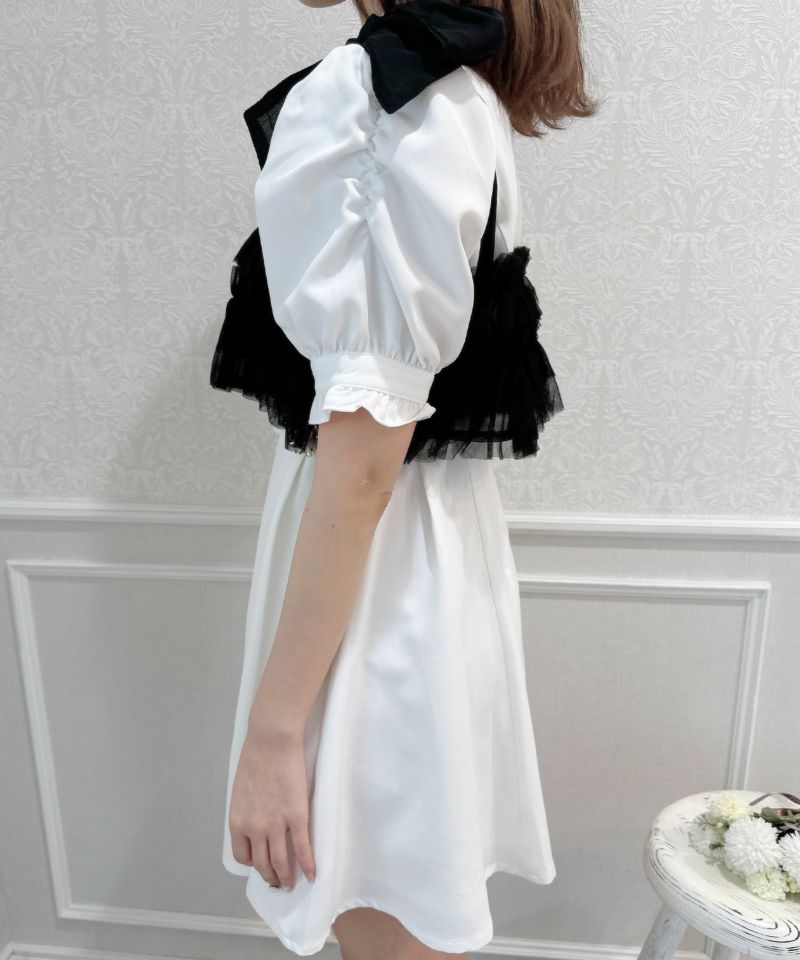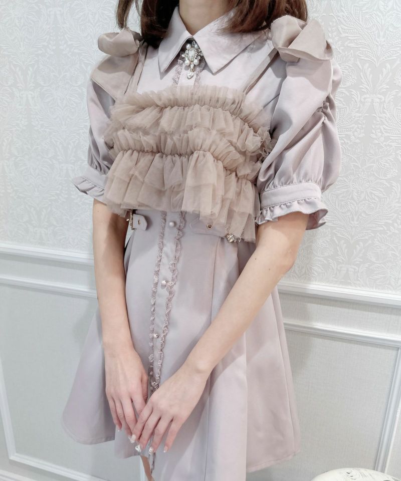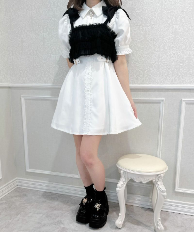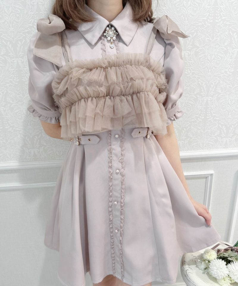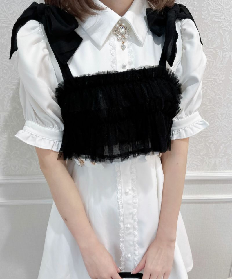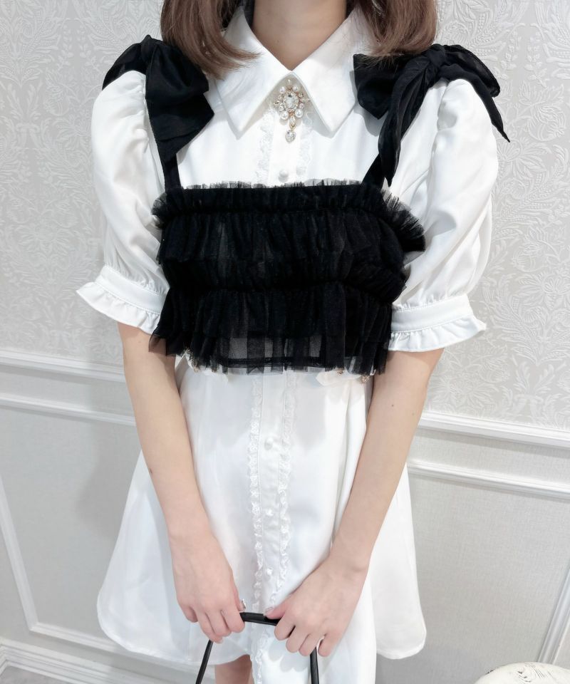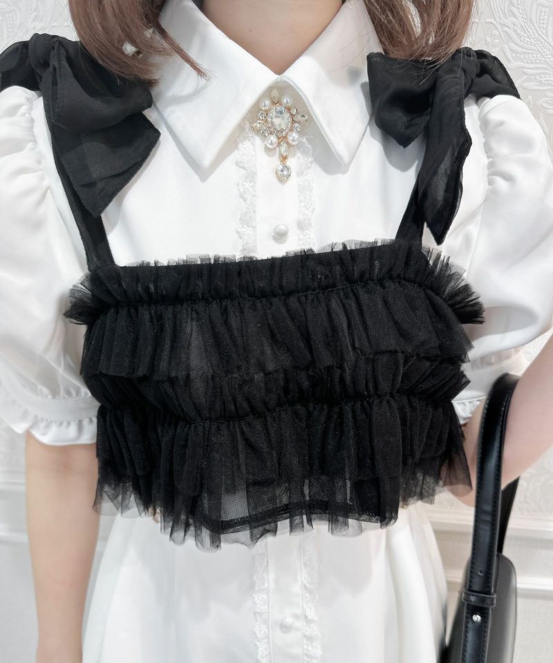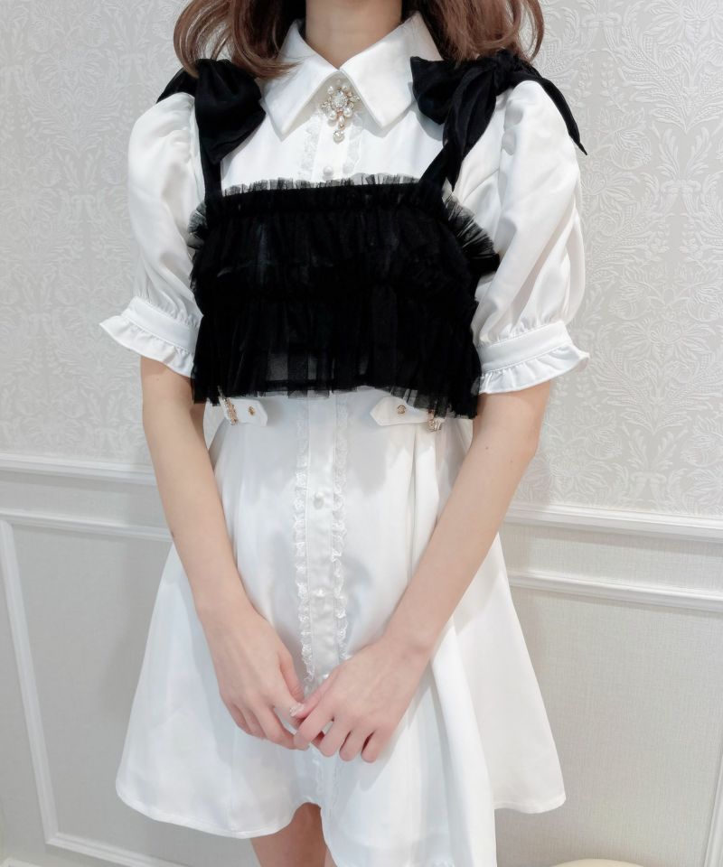 ふんわりとしたチュールビスチェとシャツワンピースのスタイリングセット♡ビスチェのショルダーには自由に結ぶタイプのリボンが付属♪コーデに悩まずアイテムそれぞれに細かいディテールを入れているので、単品使いもおしゃれな一押しアイテムです。