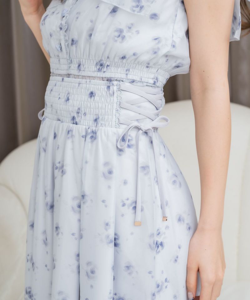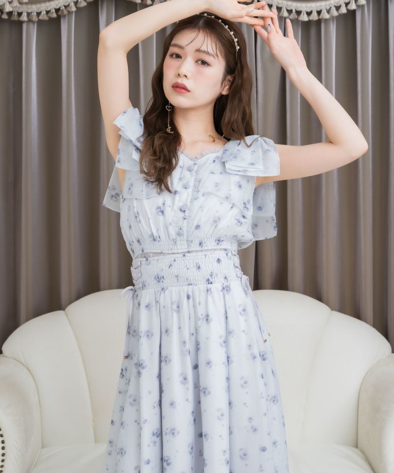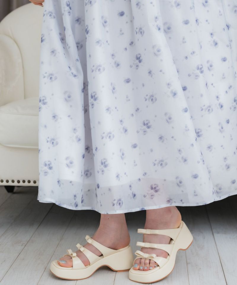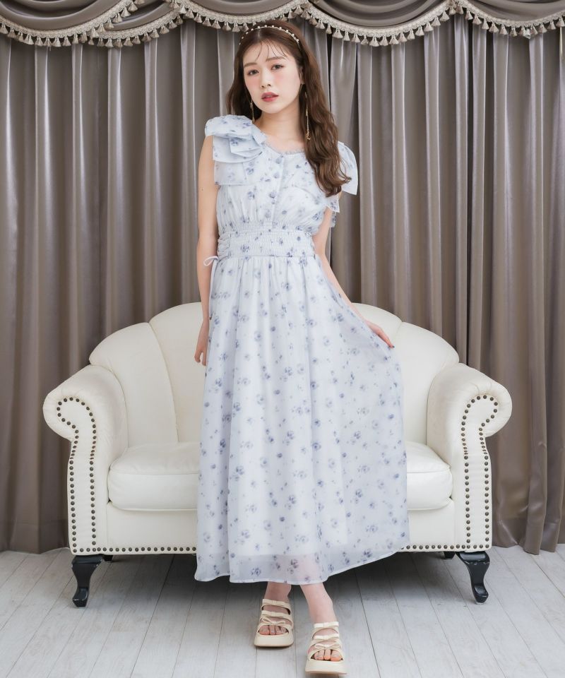 トップスIN/OUTどちらもOK♡ノースリーブブラウス×フレアスカートのセットアイテム。小ぶりで可愛い花柄と、肩に施したリボンが乙女心をくすぐります。スカートはしっかりウエストマークがされていてバランスの良いアイテム◎