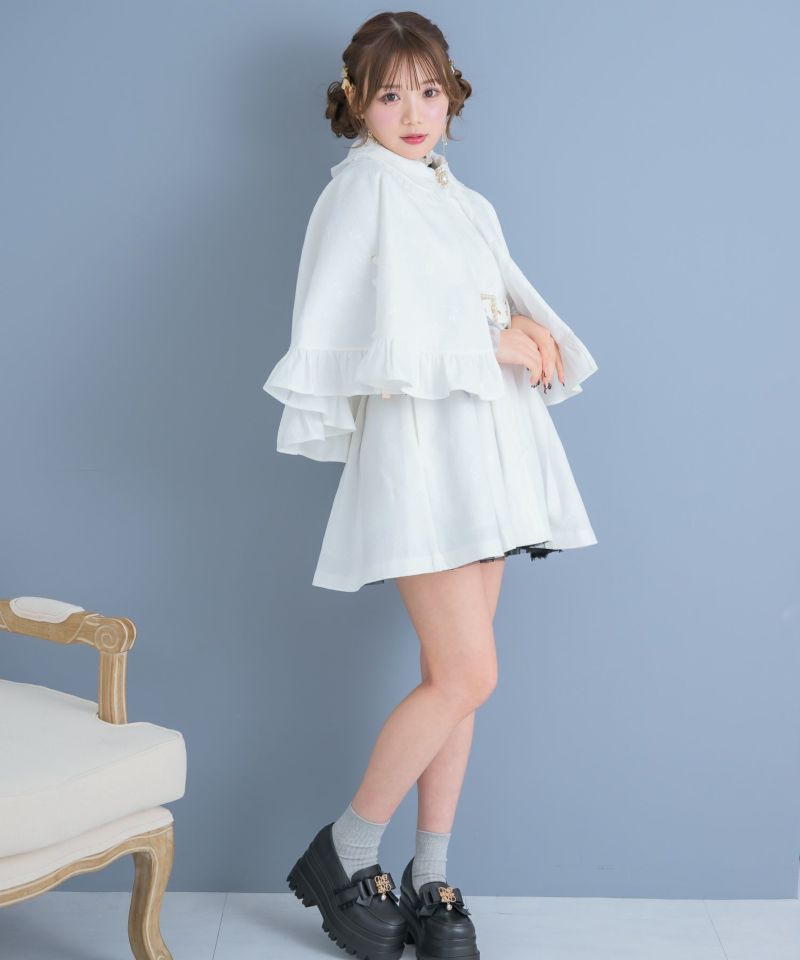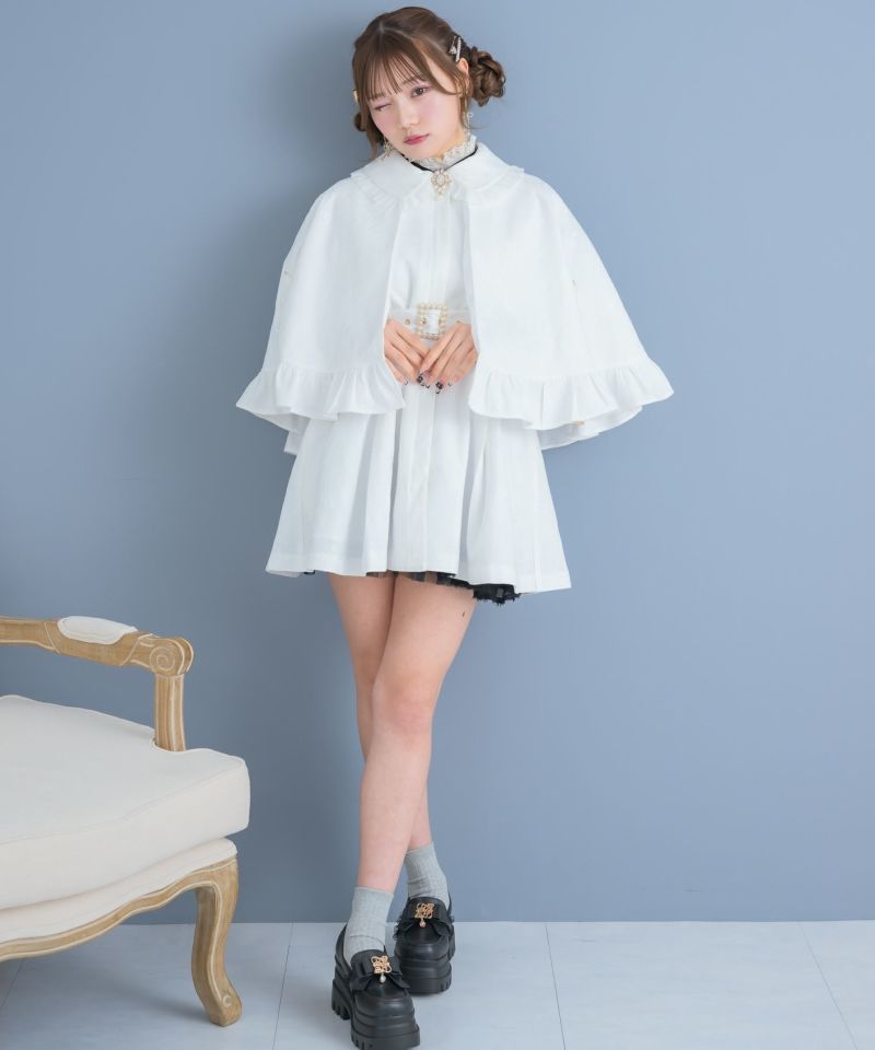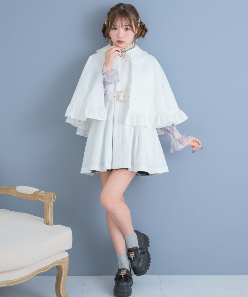 知的なムードのあるマントコートがお目見えです♪ブラック・ピンクベージュは無地、ホワイトはレースを重ねた仕様。ケープについたレースアップが可愛いアクセント♡付属ベルトがウエスト周りをすっきりと見せ、ワンピースのように着用いただけます。