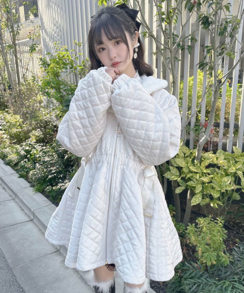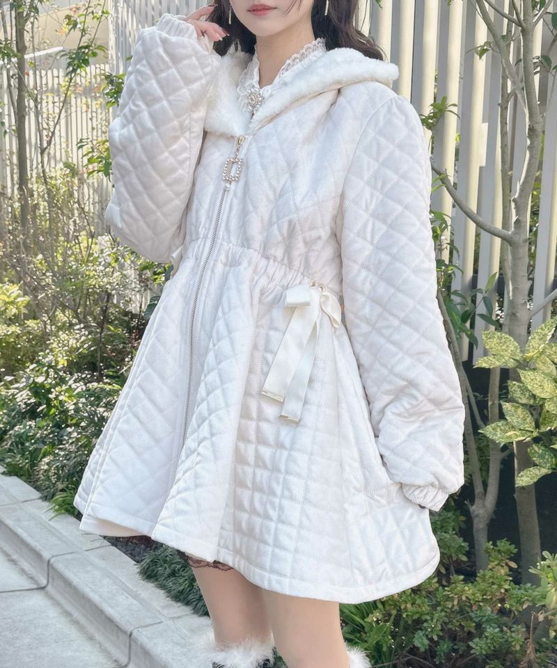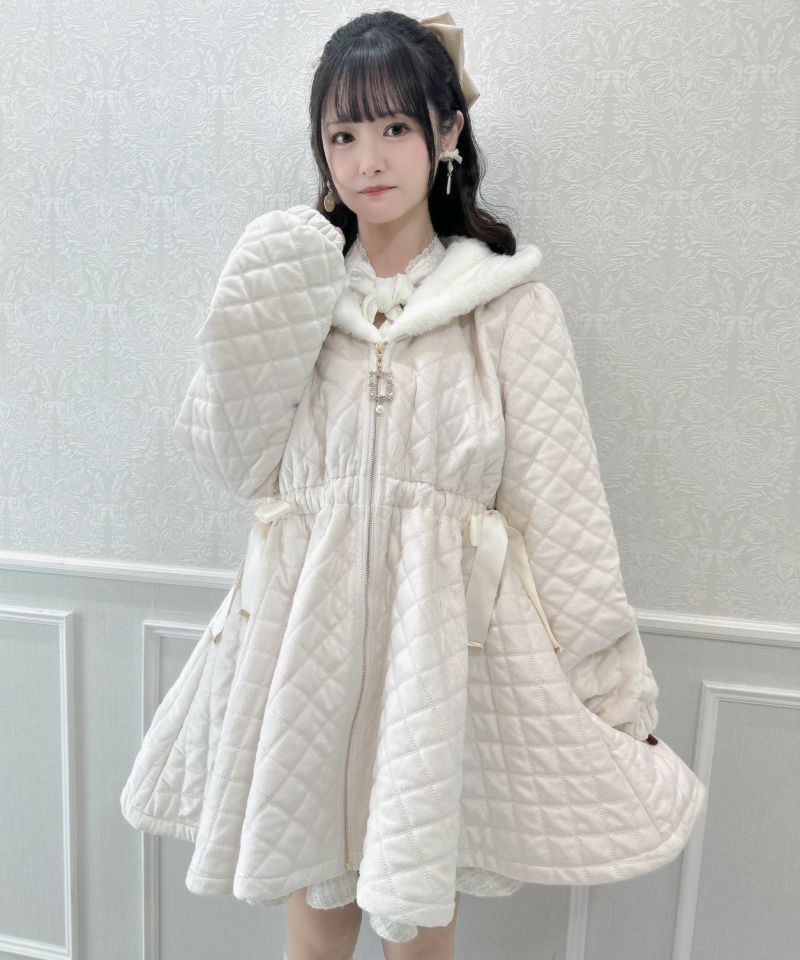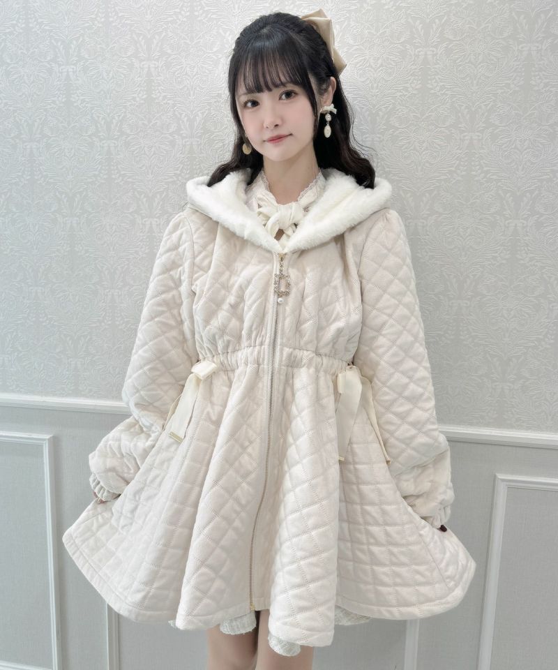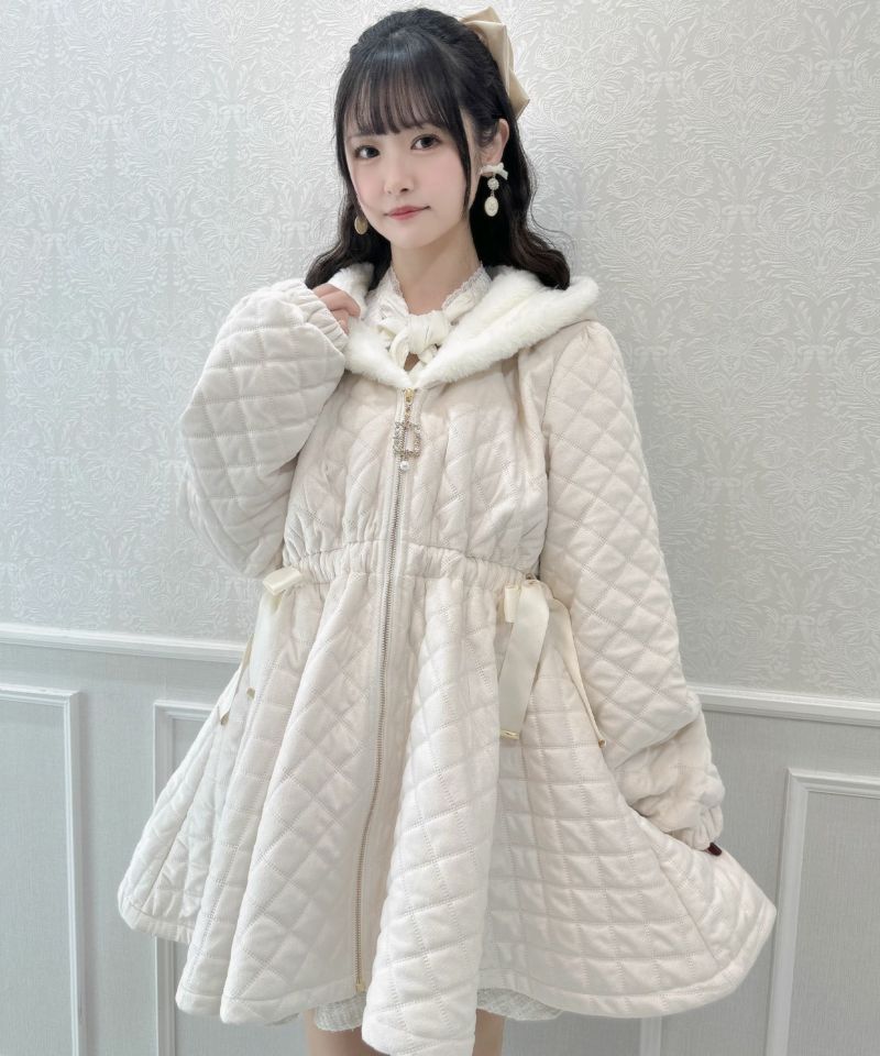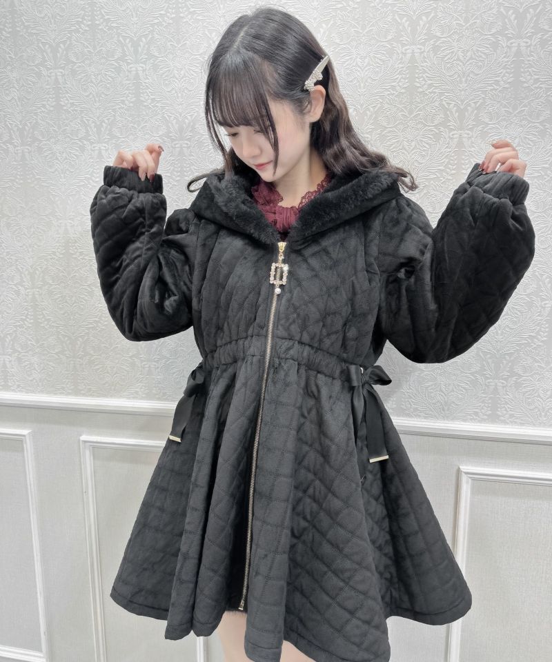 キルティング生地のフィットアンドフレアなシルエットが可愛い♡ウエストはバンディングデザインになっていて、サイドのリボンも可愛く映えてくれます。ボリュームのあるミニ丈のスカートやワンピースの上に着用いただくのがおすすめ♪