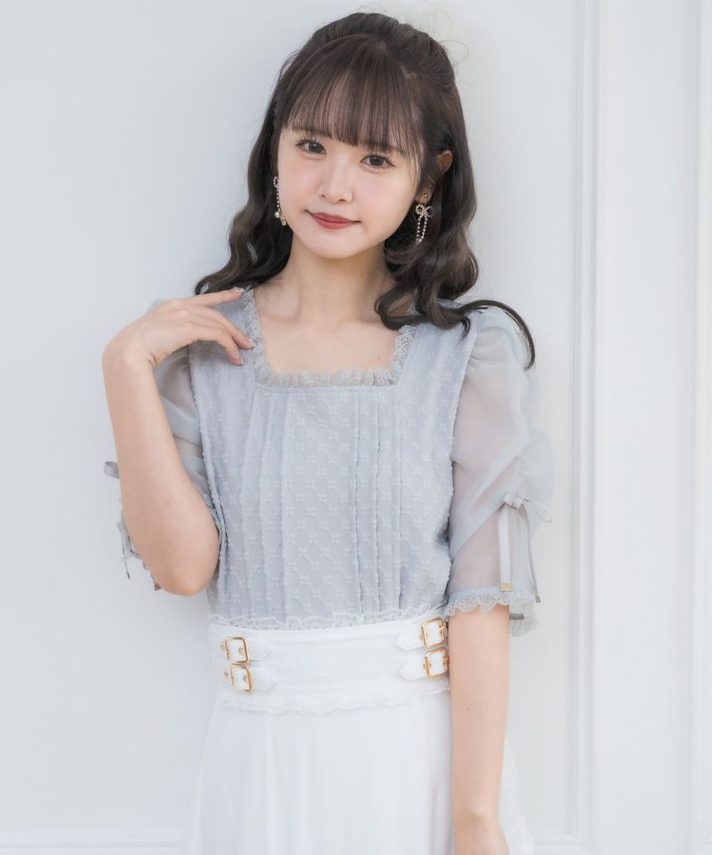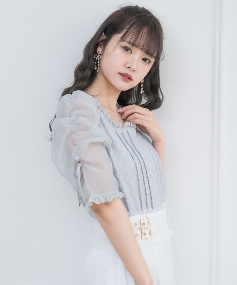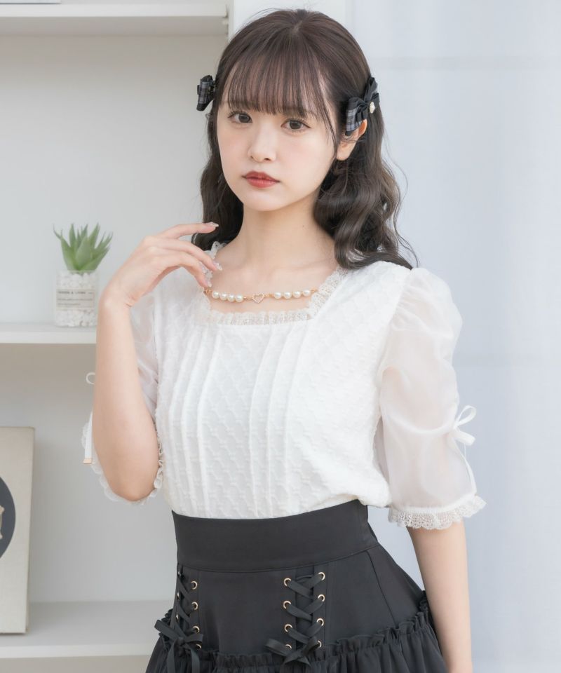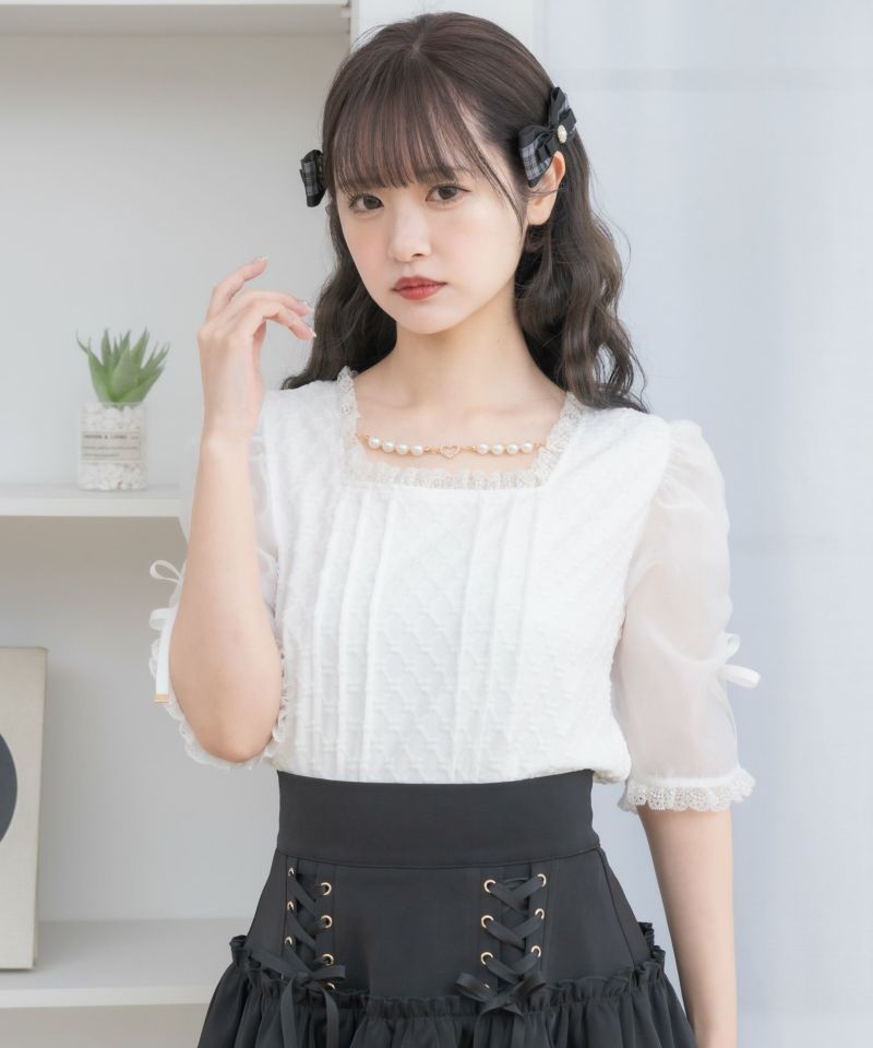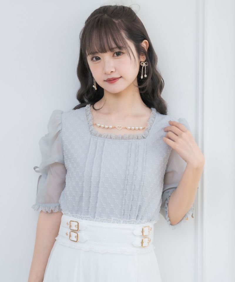凹凸のあるフラワー調の編み模様がフェミニンな印象に導く♪スッキリと開いたスクエアネックはデコルテラインを際立たせ、取り外し可能なチェーンが上品可愛くメイクアップしてくれます♡絞りを効かせたギャザースリーブも二の腕を華奢に見せてくれて◎ ※照明の関係で実際のお色味と若干異なる場合がございます。 ※表示のサイズ感と実物は若干異なる場合がございますので、予めご了承ください。 モデル身長ミント・ホワイト160cm/ブラック161cm