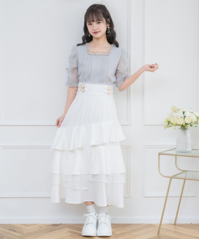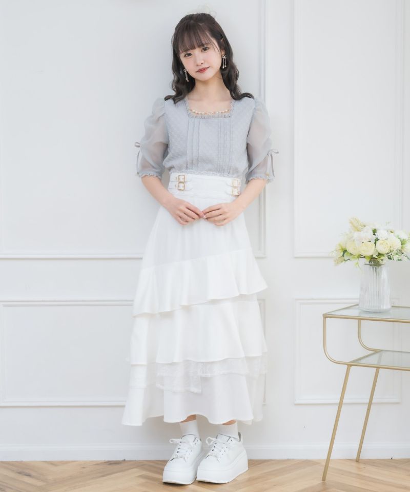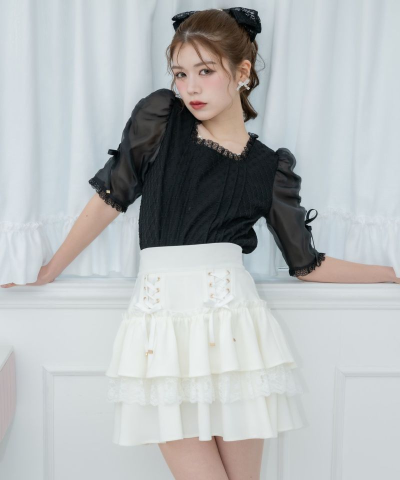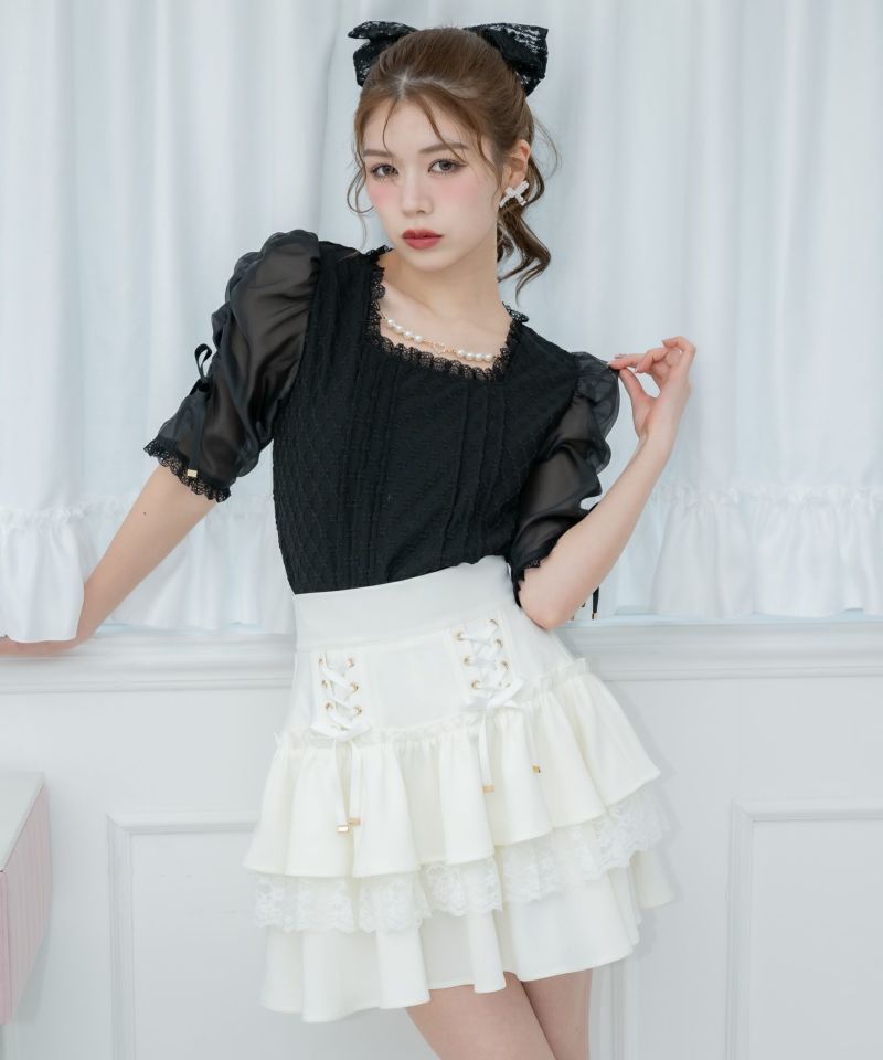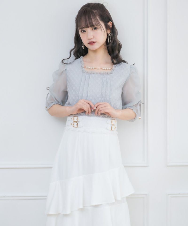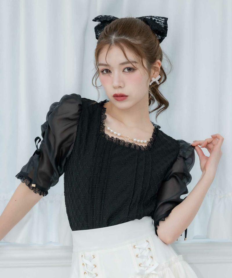 凹凸のあるフラワー調の編み模様がフェミニンな印象に導く♪スッキリと開いたスクエアネックはデコルテラインを際立たせ、取り外し可能なチェーンが上品可愛くメイクアップしてくれます♡絞りを効かせたギャザースリーブも二の腕を華奢に見せてくれて◎ ※照明の関係で実際のお色味と若干異なる場合がございます。 ※表示のサイズ感と実物は若干異なる場合がございますので、予めご了承ください。 モデル身長ミント・ホワイト160cm/ブラック161cm