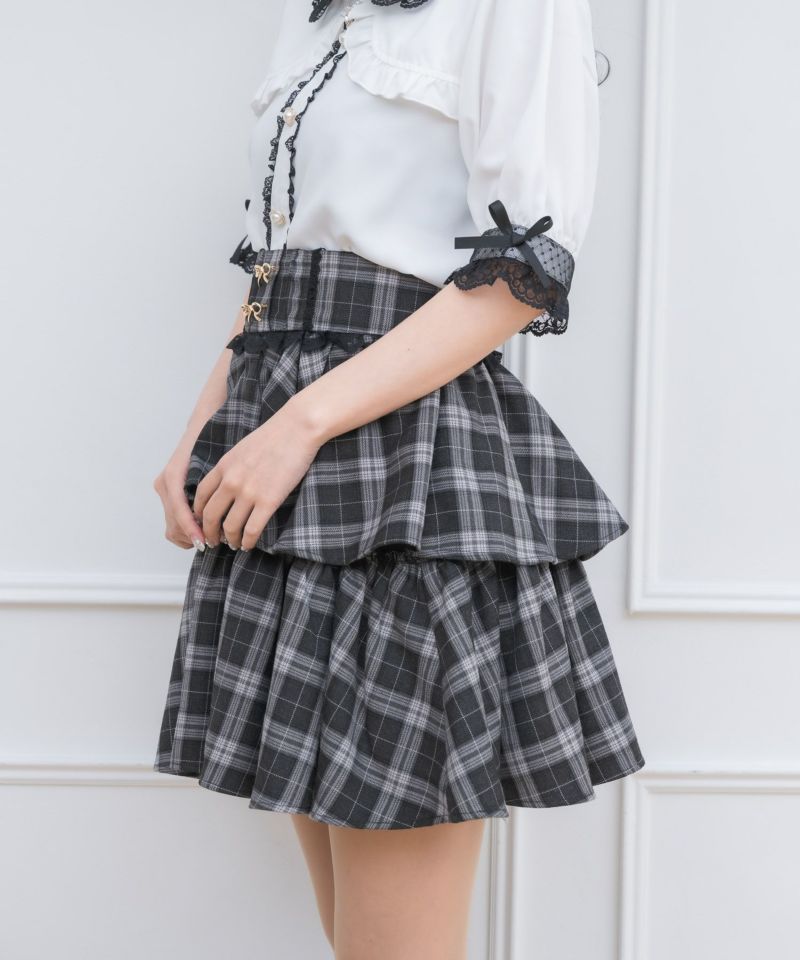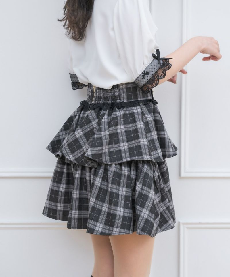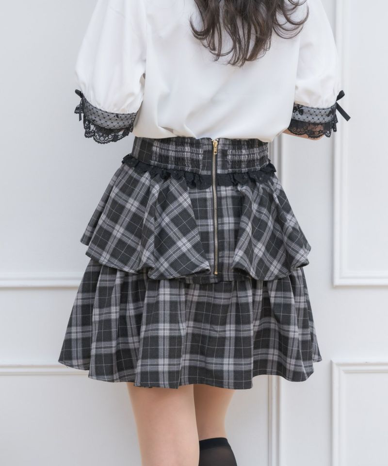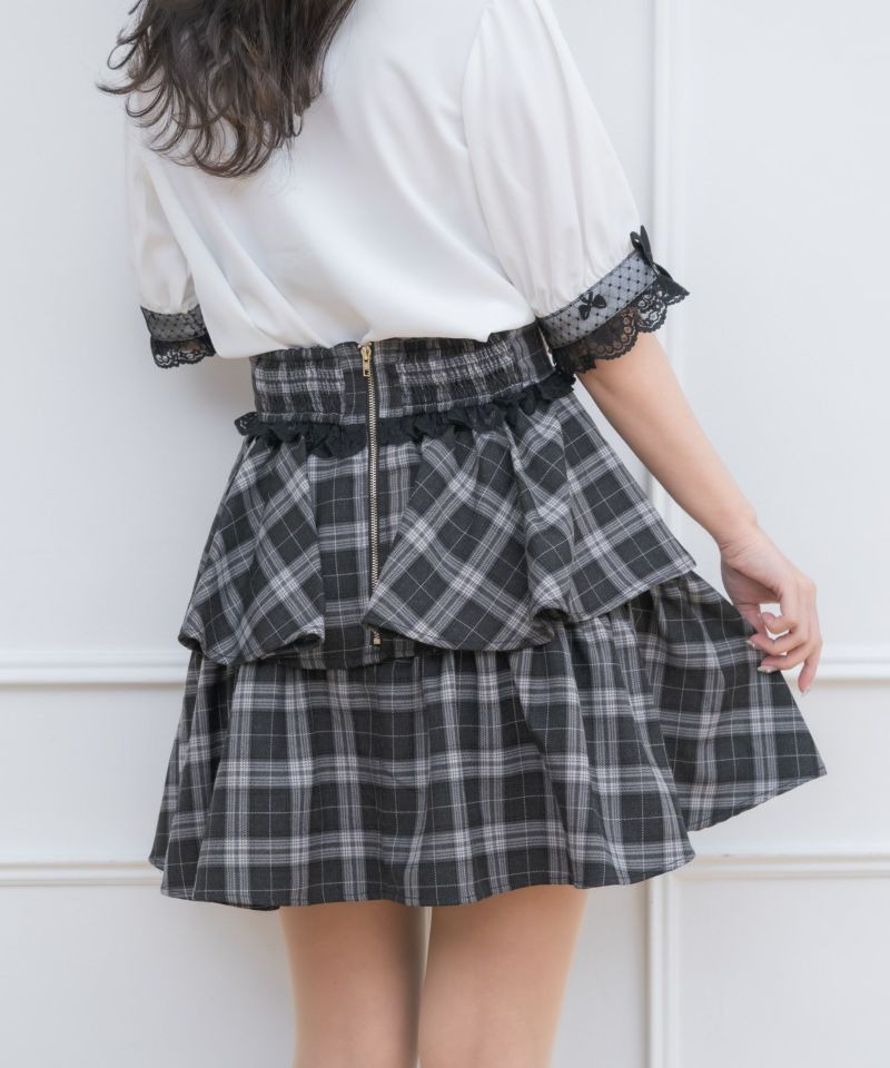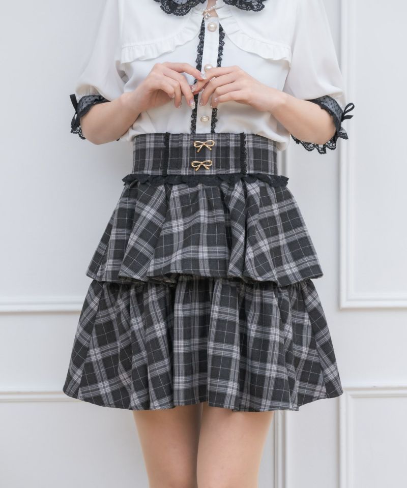 チャームポイントのメタルミニリボンがコーデのアクセントに♪ウエストはすっきりと仕立てられ、ボリューム感のある2段フリルが華やかさをプラスします。コーデの主役になるチェックと、マルチに活躍期待のブラックの2色展開です。