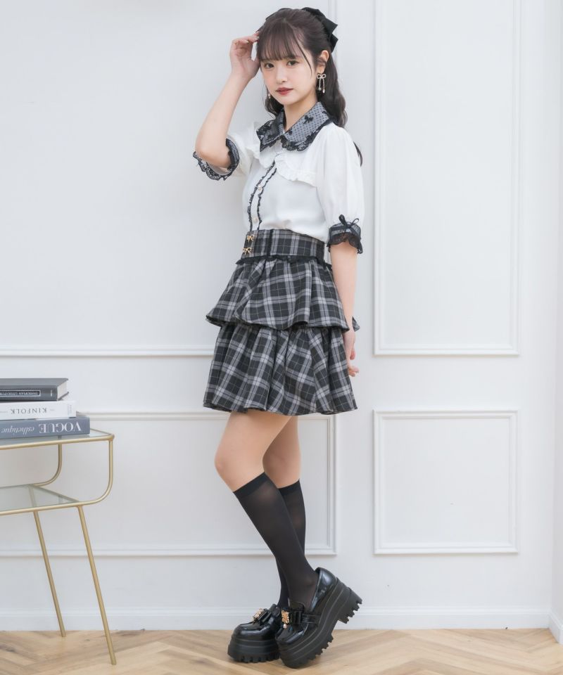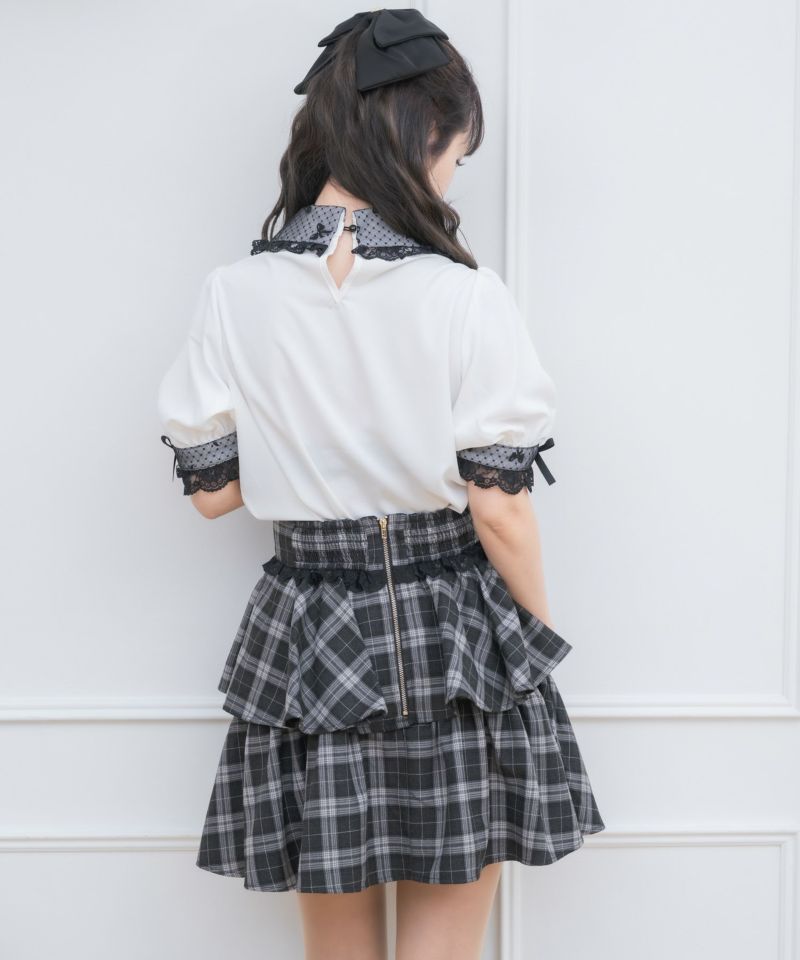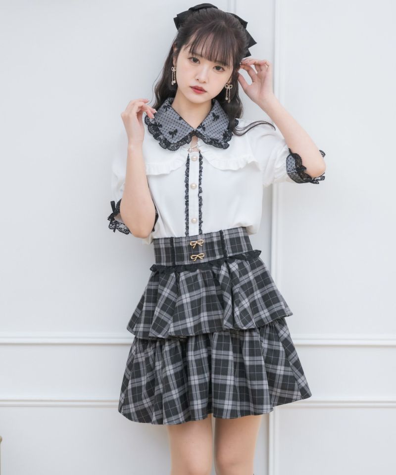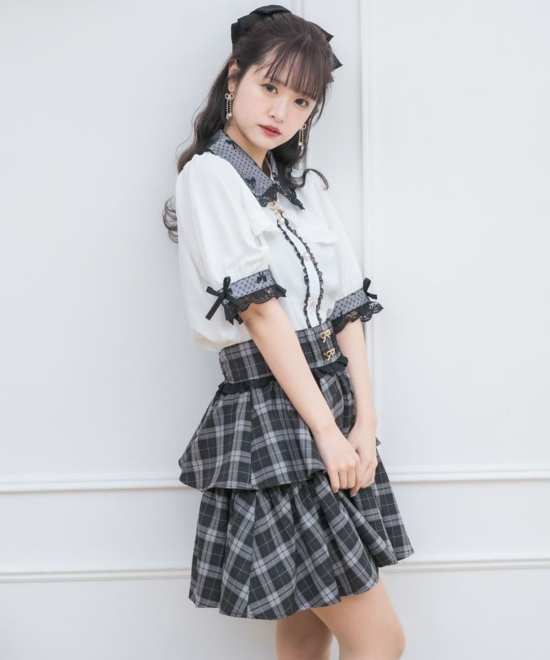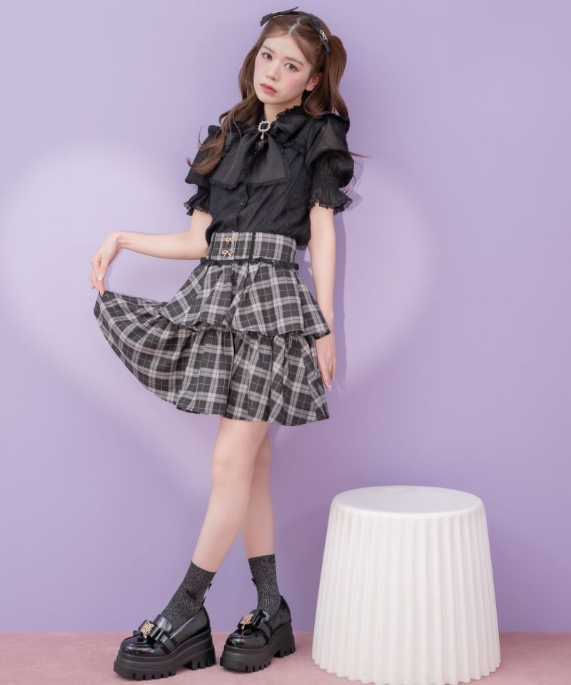 チャームポイントのメタルミニリボンがコーデのアクセントに♪ウエストはすっきりと仕立てられ、ボリューム感のある2段フリルが華やかさをプラスします。コーデの主役になるチェックと、マルチに活躍期待のブラックの2色展開です。