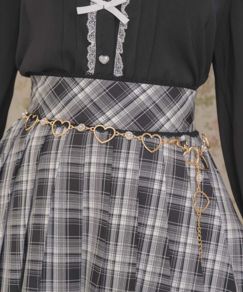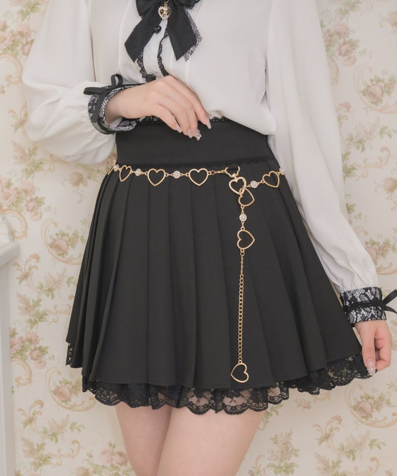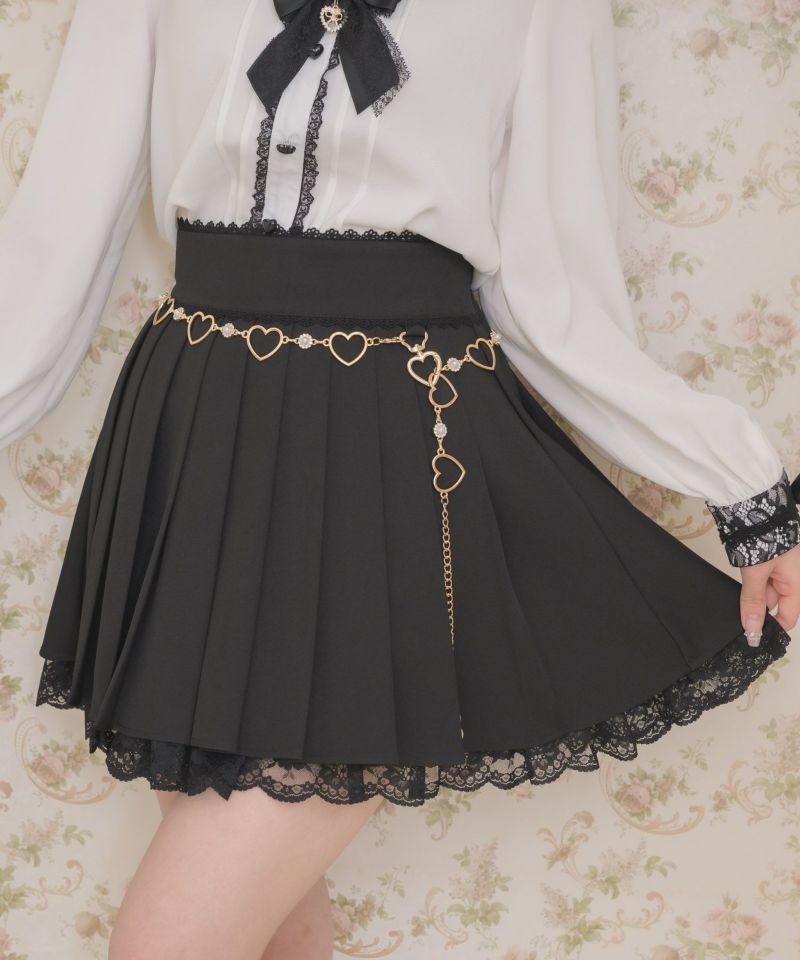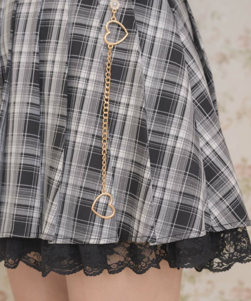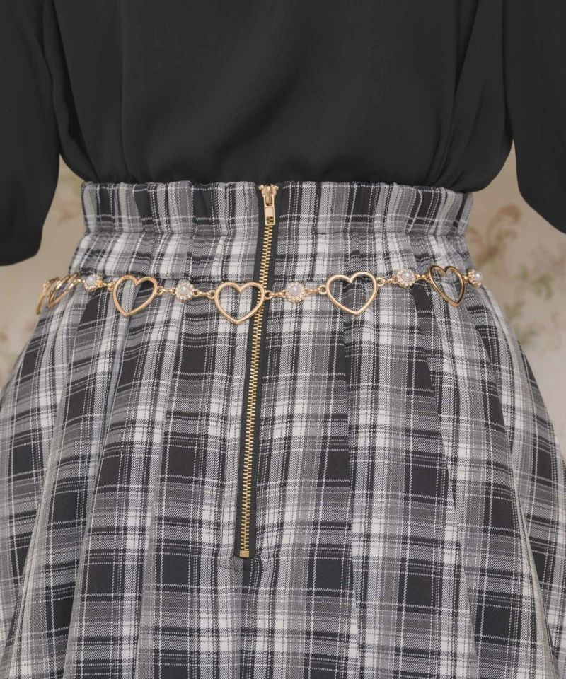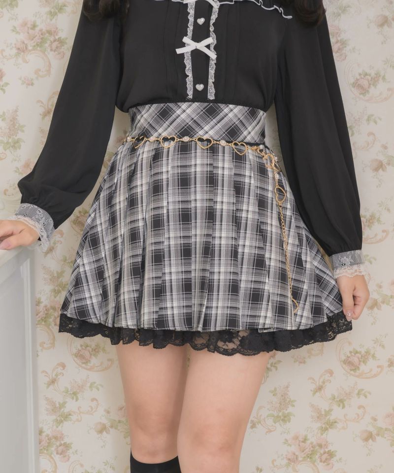 ※インナーパンツ付き ガーリッシュなプリーツデザイン、ハートたっぷりなチェーンが愛らしさをアピールするスカート。レースを追加したことでスクール感が緩和され、デイリーユースな仕様にチェンジ。ベルトの位置がずれないように、スカート本体にループ&リングを追加♡インナーパンツ付きです♪ ※照明の関係で実際のお色味と若干異なる場合がございます。 ※表示のサイズ感と実物は若干異なる場合がございますので、予めご了承ください。 モデル身長ブラック・ピンク163cm/チェック162cm