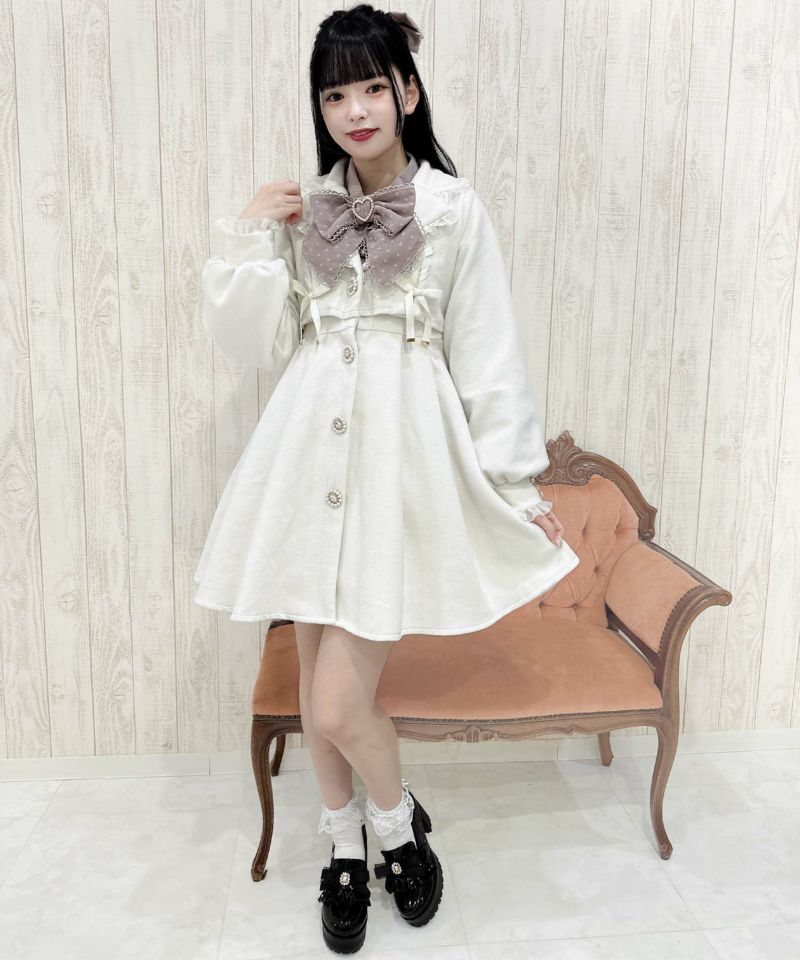 柔らかな雰囲気を醸し出すシアーフリルが軽やかな着こなしをアシストします♡ワンピースのように着こなせるかわいいルックスが冬のシーズンコーデを盛り上げます。Vネックで首元が開くので、中にボウタイブライスをきて外に出してきてもかわいいです♪