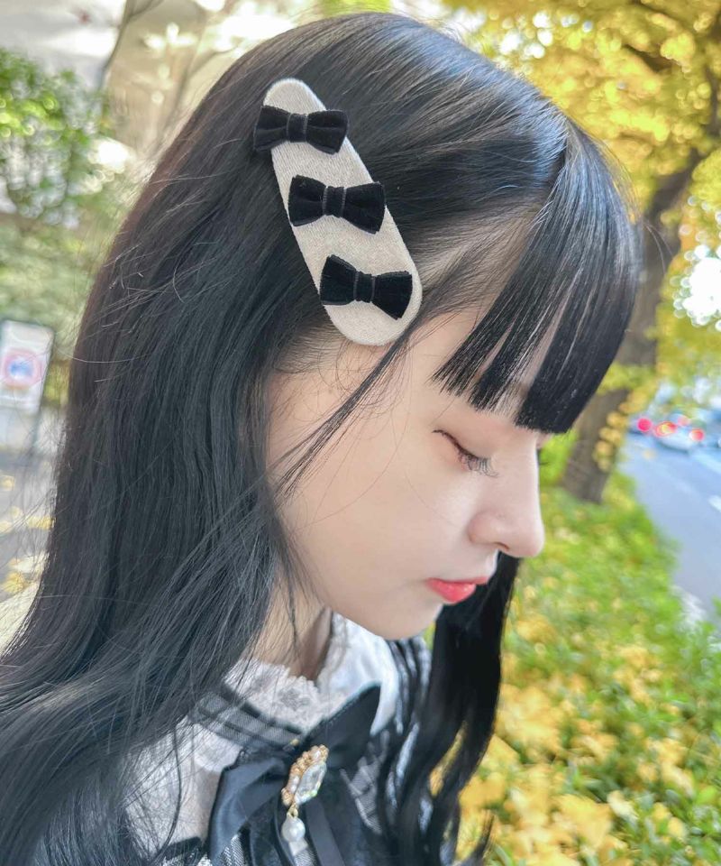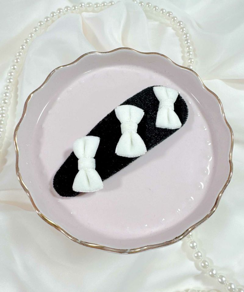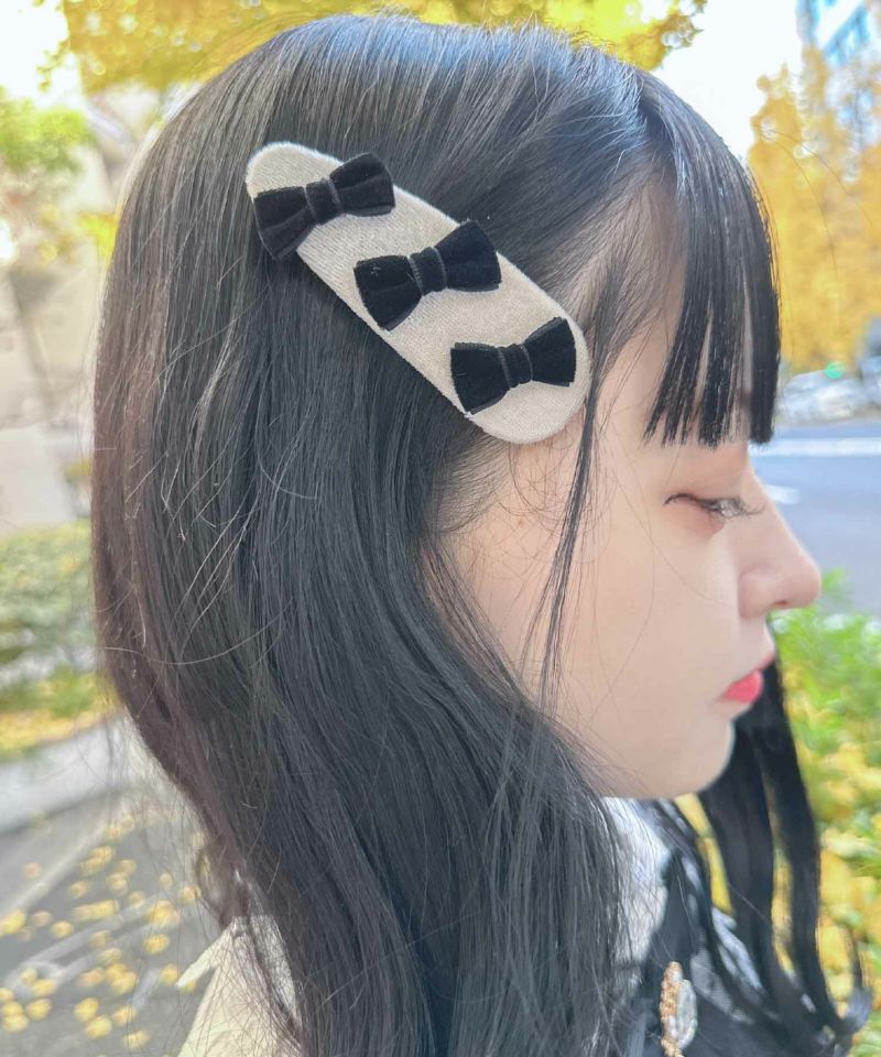 ベロア調で大人可愛いヘアピンのお目見えです。ヘアスタイル関係なく着用いただけ、簡単に装着できるのでデイリーユースに重宝すること間違いなし◎配色のリボンがアクセントになって、上品な印象を添えてくれます。
