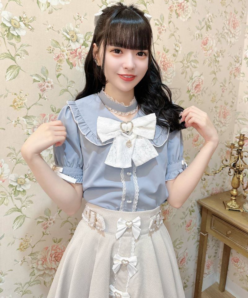 パールチェーン付きのリボンブローチが周りとの差をつける量産型ブラウス♡リボンはレース配色になっているので目立って可愛いです♪ぷっくりと立体的なハート釦も女の子らしいディテールポイント◎前たては見せかけで、後ろのスナップボタンで着脱できます。