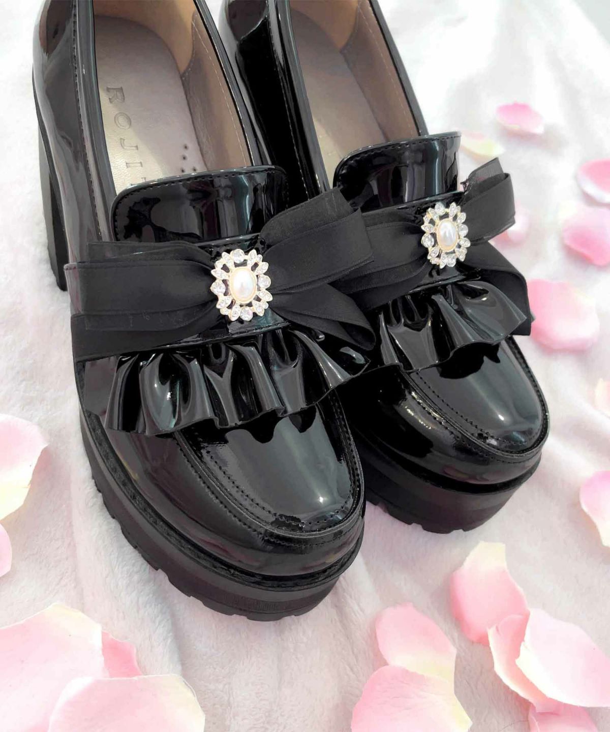 リングバックル付エナメルフリルシューズ