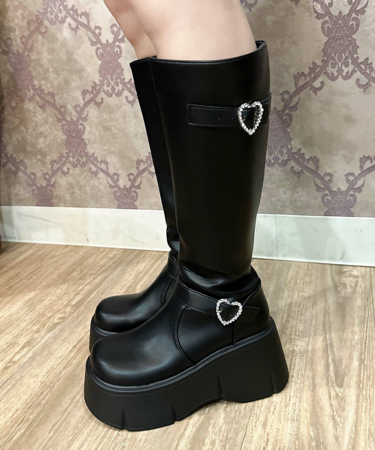 ビジューバックル厚底ロングブーツ