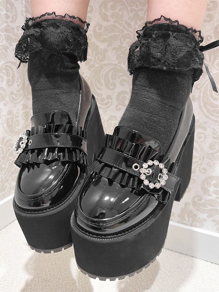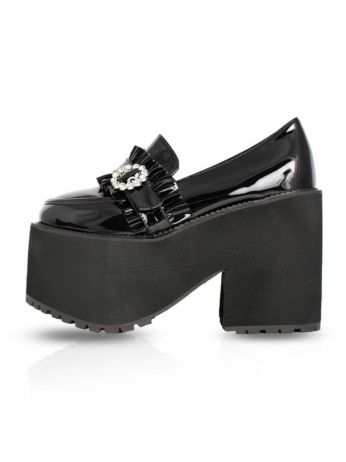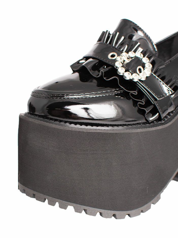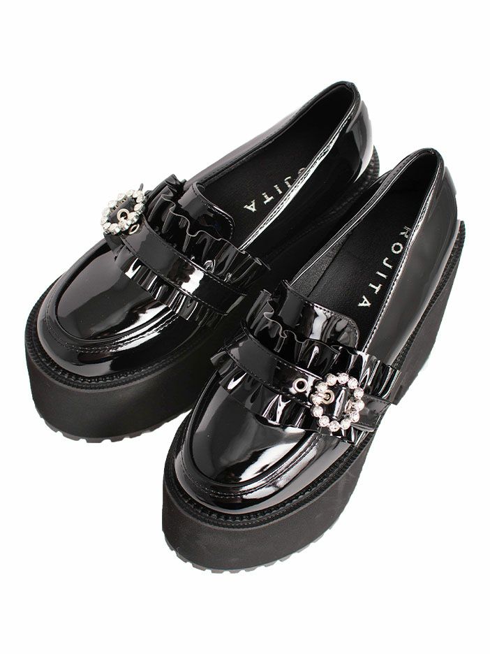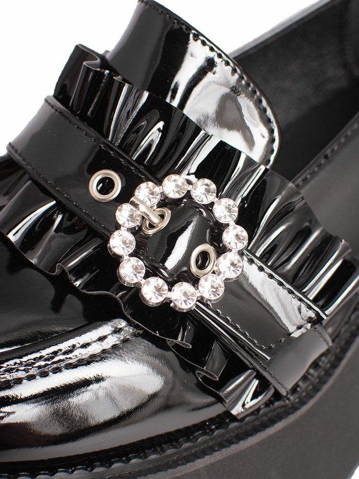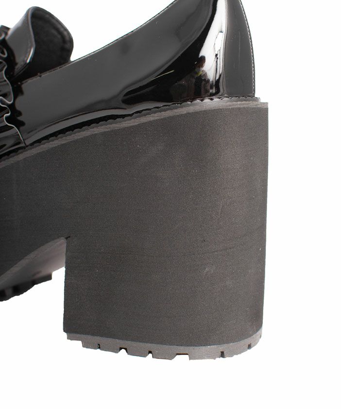 スパイスを効かせるリングバックルがポイント。フリルをプラスして甘さを加えたローファーです。エナメルの光沢感が上品な印象に◎ 歩きやすい太めのヒールには高さがあり、脚を綺麗に見せてくれる嬉しい効果も♪カジュアルコーデの格上げにも効く、頼れるクラスアップアイテムです。