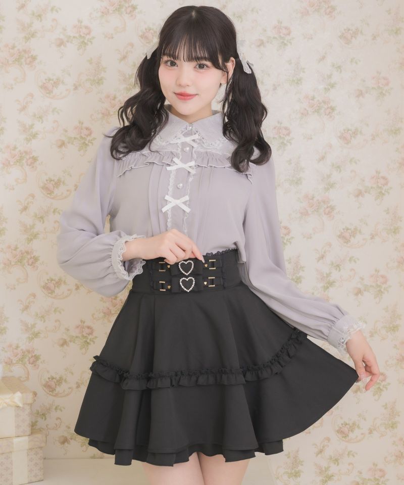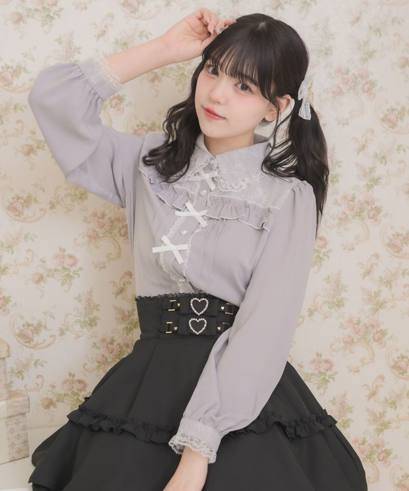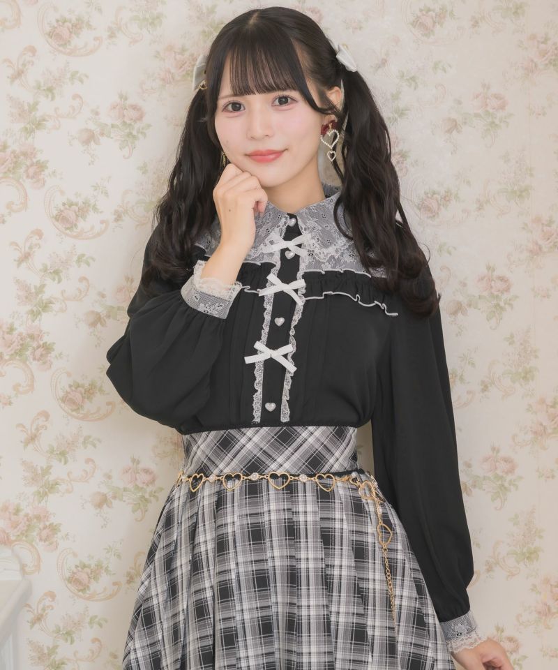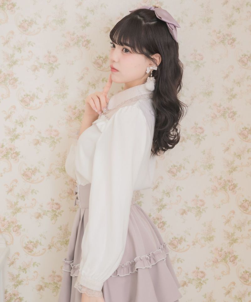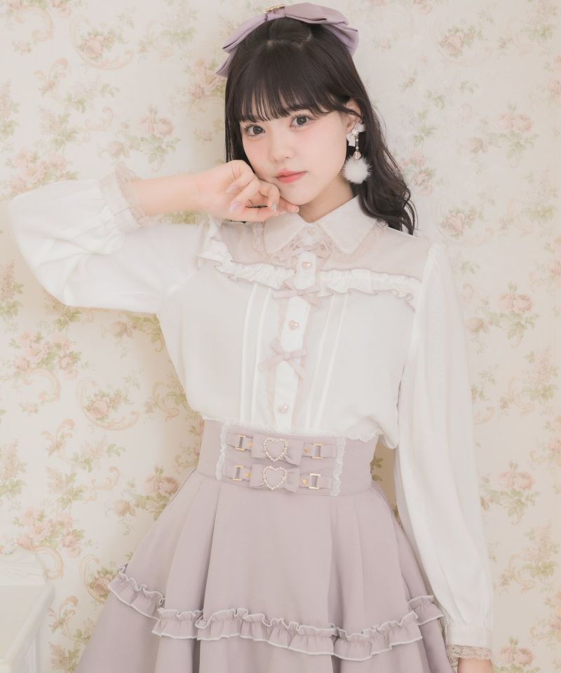 衿とヨークのレース使いが華やかに着飾るブラウスのお目見えです。ロマンティックなハート釦との間にリボンを並べ、ピンタックが縦のラインを強調しスタイルアップを促します♪レースとディテールの色味を揃えたことでスタイリングしやすく設計♡淡い色味のバランスが好印象なアイテムです。 ※照明の関係で実際のお色味と若干異なる場合がございます。 ※表示のサイズ感と実物は若干異なる場合がございますので、予めご了承ください。 モデル身長ブラック162cm/パープル・ホワイト163cm