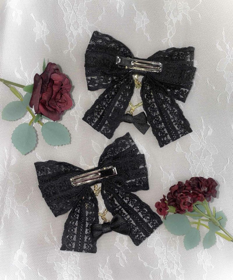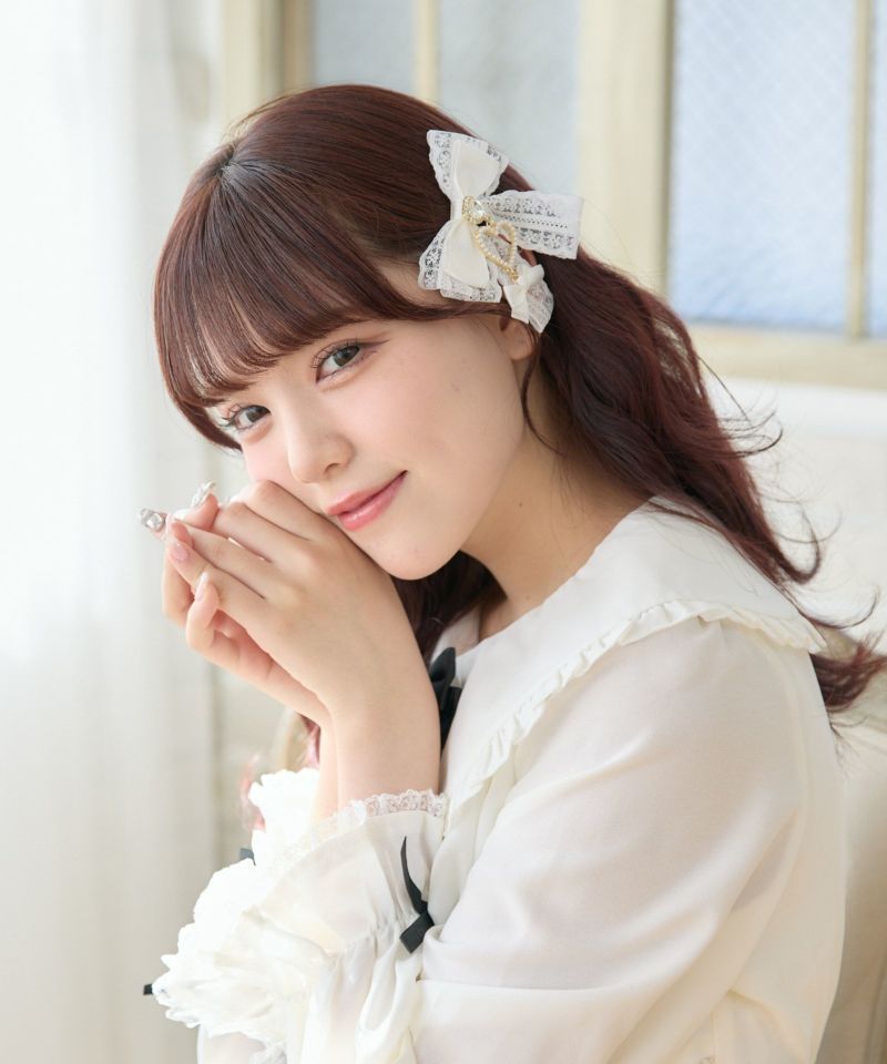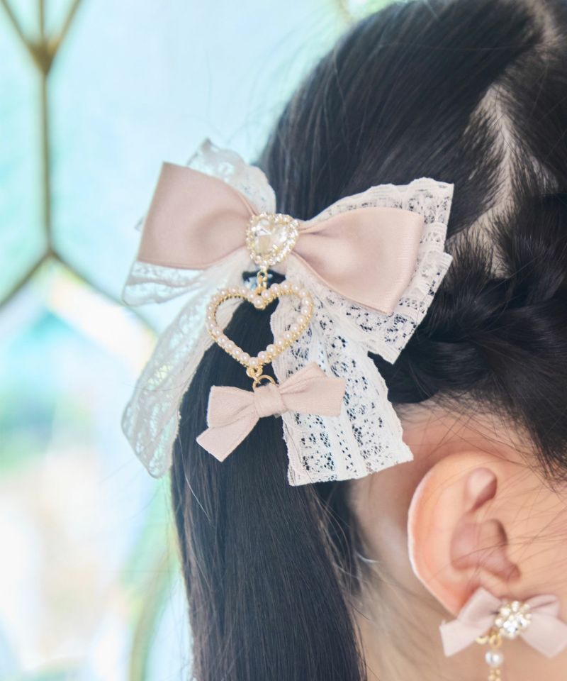 繊細なレースとリボンが重なり合い、ロマンティックで上品な雰囲気を演出するヘアクリップ。ハートチャームと小さなリボンが揺れ動くたび、さりげない可憐さと華やかさをプラス。大人可愛い世界観を完成させてくれる、とっておきのアイテムです♡