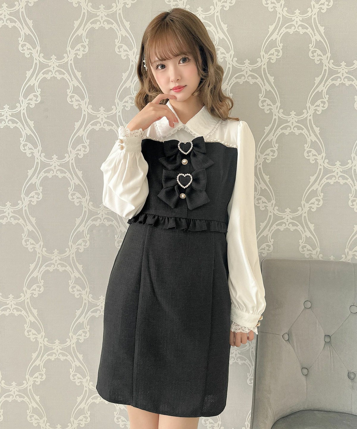 パールライン切替ダブルリボン付ワンピース